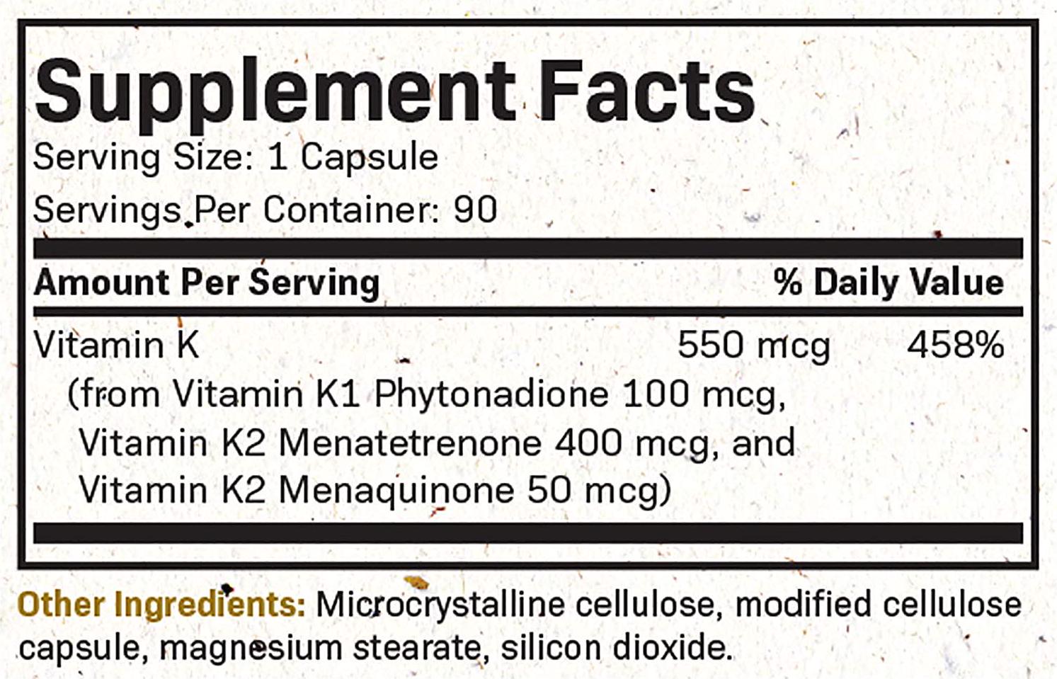 - FULL SPECTRUM COMPLEX VITAMIN K SUPPLEMENT: Provides both Vitamin K1 and two forms of Vitamin K2, Vitamin K2 MK4 (Menatetrenone-4) and Vitamin K2 MK7 (Menaquinone-7).