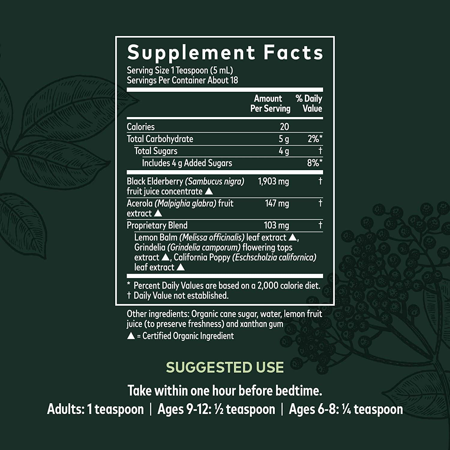 - Made with Certified Organic Black Elderberries and Grindelia for immune support, plus Lemon Balm and California Poppy to gently support a good night's sleep