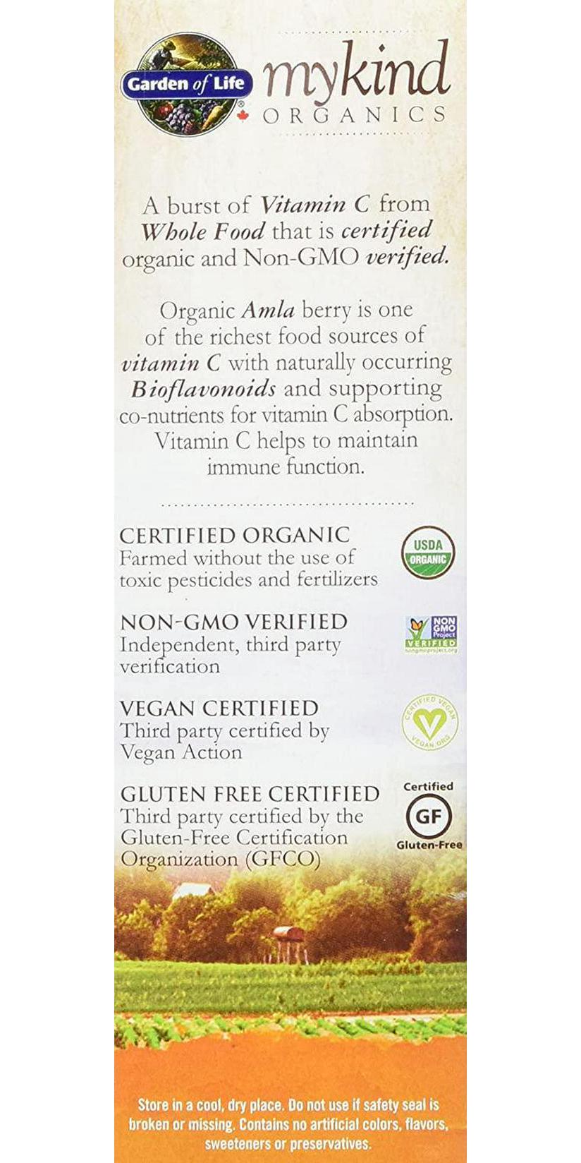 60mg of Vitamin C from Certified Organic/Non-GMO Verified Whole Foods. Organic Amla Berry with Bioflavonoids and Co-Nutrients for Vitamin C Absorption. Supports Immune System. Promotes Skin and Tissue Health. Yummy Cherry-Tangerine Taste