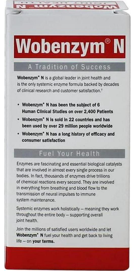 Wobenzym N is a global leader in joint and inflammation health and Wobenzym N is the only systemic enzyme formula backed by decades of clinical research and customer satisfaction. Enzymes are fascinating and essential biological catalysts that are involved in almost every single process in our bodies. In fact, thousands of enzymes drive trillions of chemical reactions every second. They are involved in everything from breathing and blood flow to the transmission of neural impulses to immune system maintenance. Systemic enzymes work holistically - meaning they work throughout the entire body - supporting the body's natural response to inflammation and overall joint health.