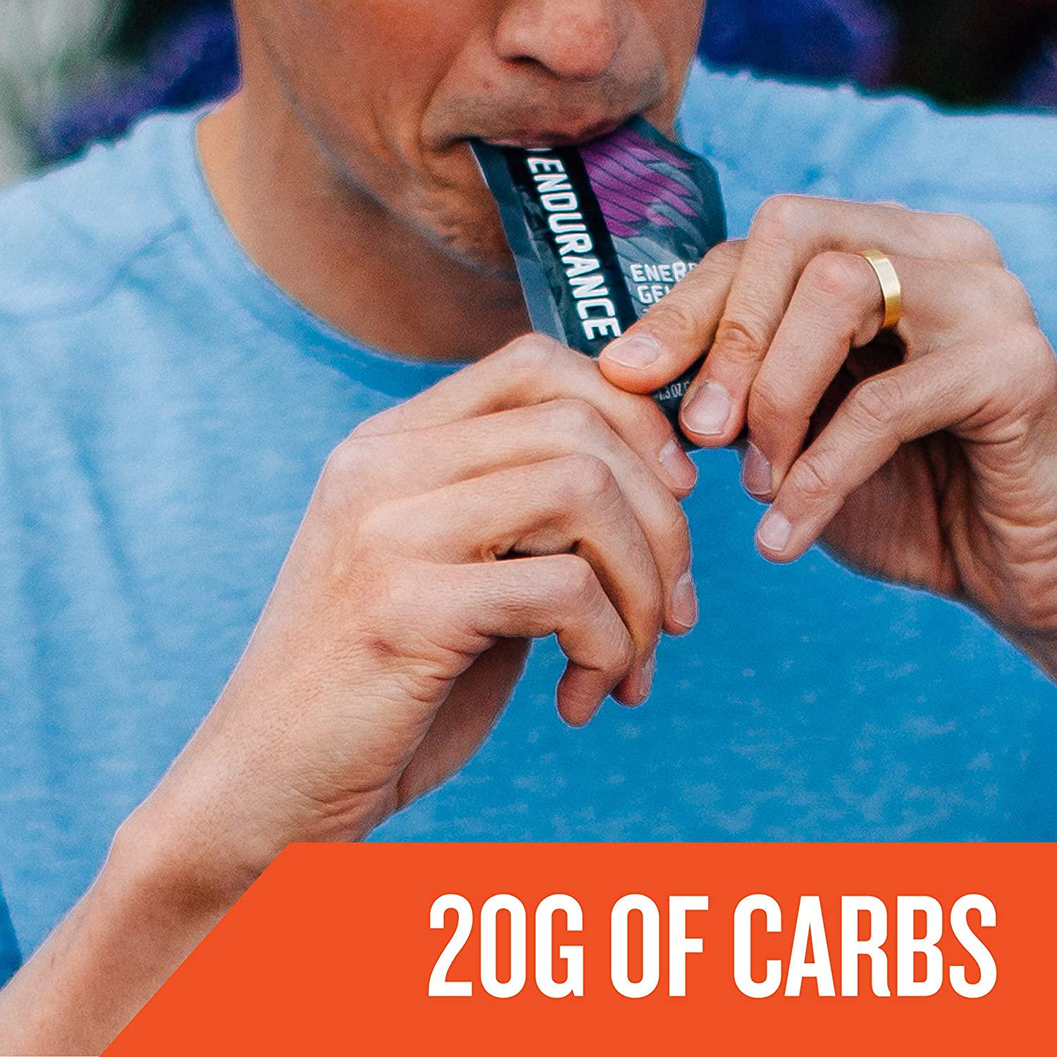 - Each Energy Gel Packet contains 20g of carbs and 100mg of sodium, totaling 80 calories, thus delivering that essential balance that can both boost and sustain an athlete s performance