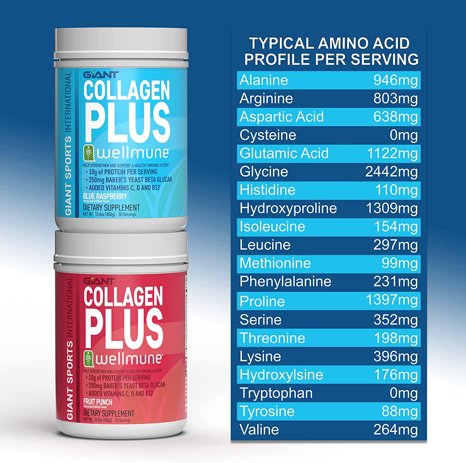 - AMAZING FRUITY TASTE: Giant Sports International has been known for its superior flavor systems and our Collagen Plus Wellmune uses our flagship method of testing and tasting. We know you’ll love drinking Collagen Plus Wellmune as much as we do. Get ready to experience the highest standard in flavor you have ever tasted in a collagen product.