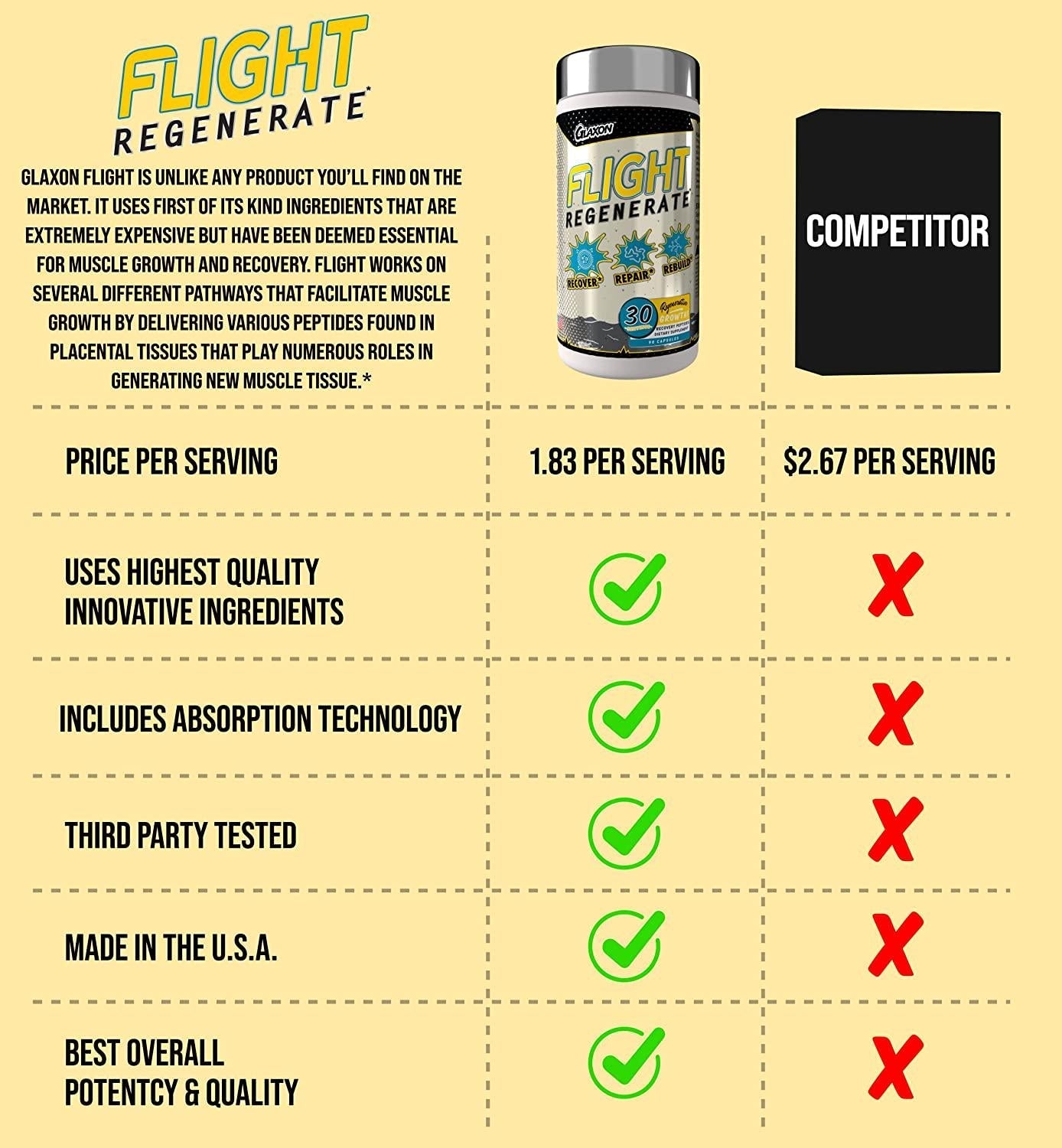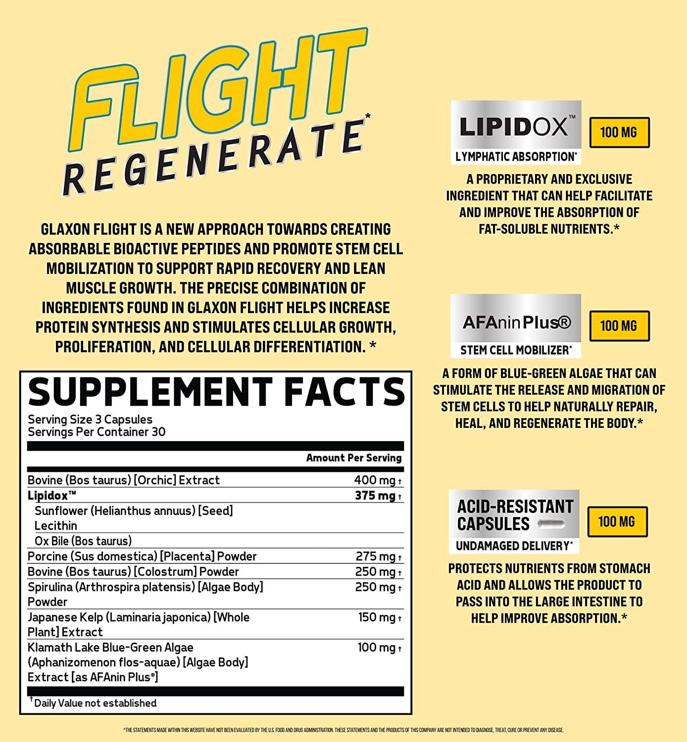 Flight is an interesting new approach towards creating absorbable bioactive peptides. Additionally, we make an attempt at liberating more stem cells into systemic circulation to further assist in growth and recovery. Through the use of various organ extracts and marine algaes, it is the goal of Flight to promote new growth and regeneration of rapidly growing muscle tissues in a way that has never been done before.