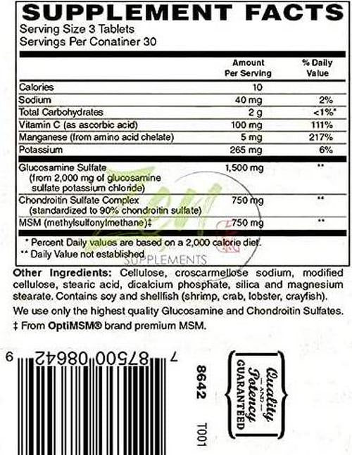 - COMPLETE FORMULA - Full-Spectrum And Shell-Fish Free Glucosamine Joint Supplement Containing 1,500mg Glucosamine Sulfate, 750mg Chondroitin Sulfate, 750mg MSM, With Potassium, Manganese And Vitamin C Added For Enhanced Benefits. Bottle Includes (90) Pills, In The Form Of Easy-To-Swallow Capsules.