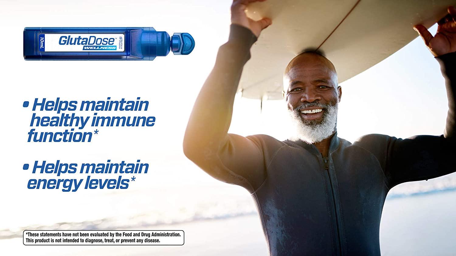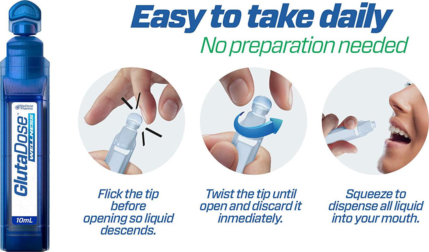 - TWO MONTH SUPPLY INCLUDED - The 60 Doses box includes 60 single-dose liquid vials of GlutaDose. Vials are ready to use, require no preparation or mixing. It is recommended to take one vial-a-day. Simply open the plastic vial, release the liquid into your mouth, hold for 5 -10 seconds and then swallow.