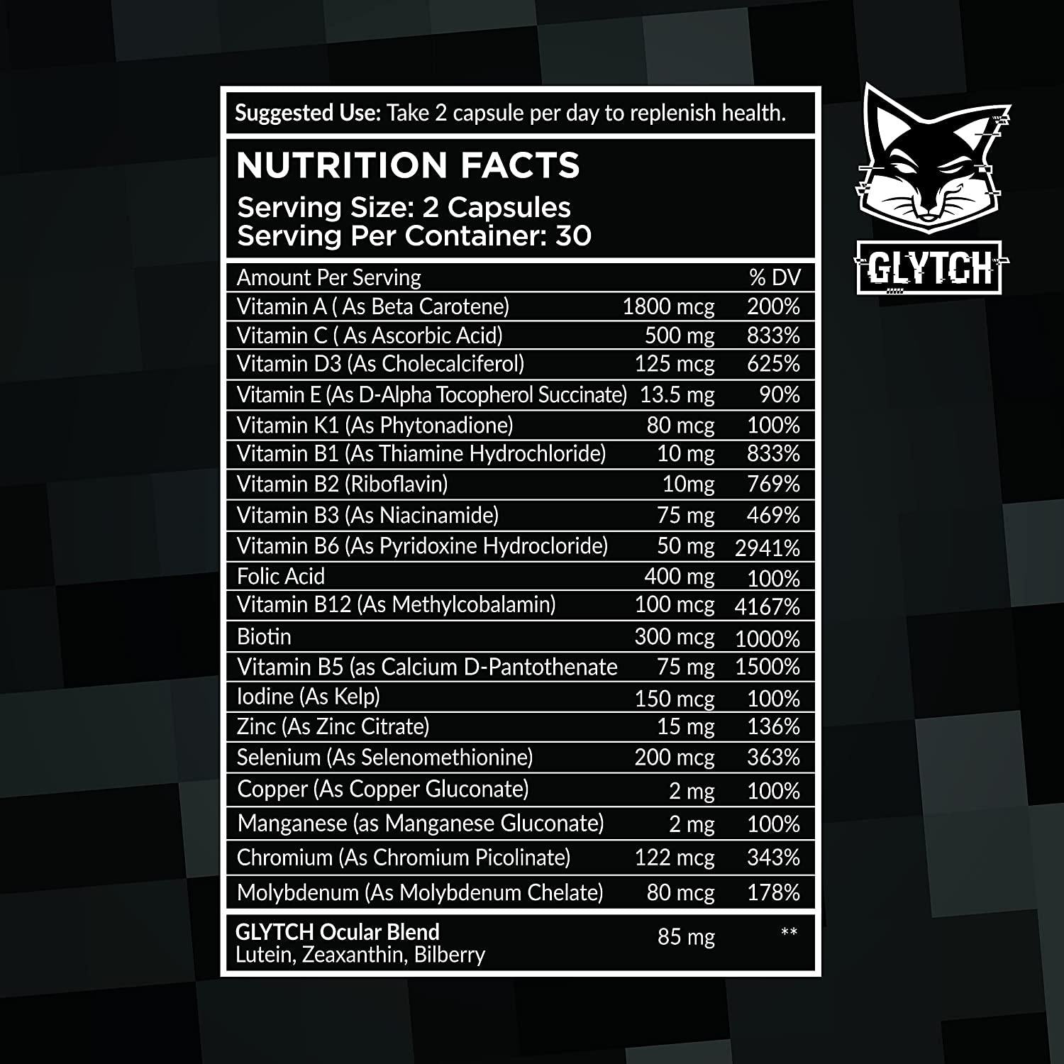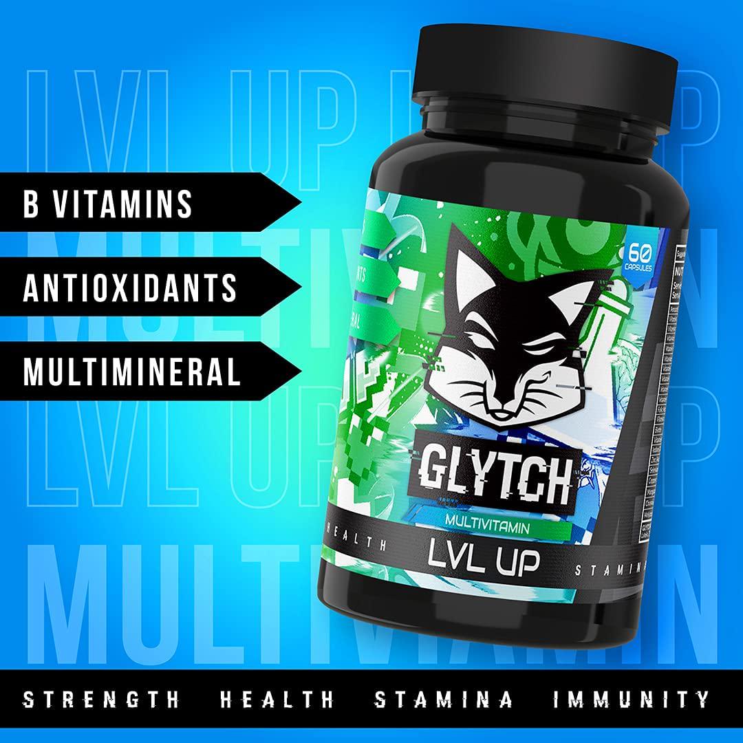THE GAMERS MULTIVITAMIN 60 Capsules B Vitamins Antioxidants Multimineral Youve taken some hits and your health is running low. Time to replenish and LEVEL UP! GLYTCH LEVEL UP is the first multivitamin formulated for gamers. Enhanced with B vitamins and GLYTCHs Ocular Blend, these ingredients help to reduce the damaging effects of blue light from screens.