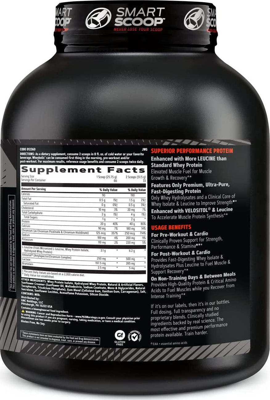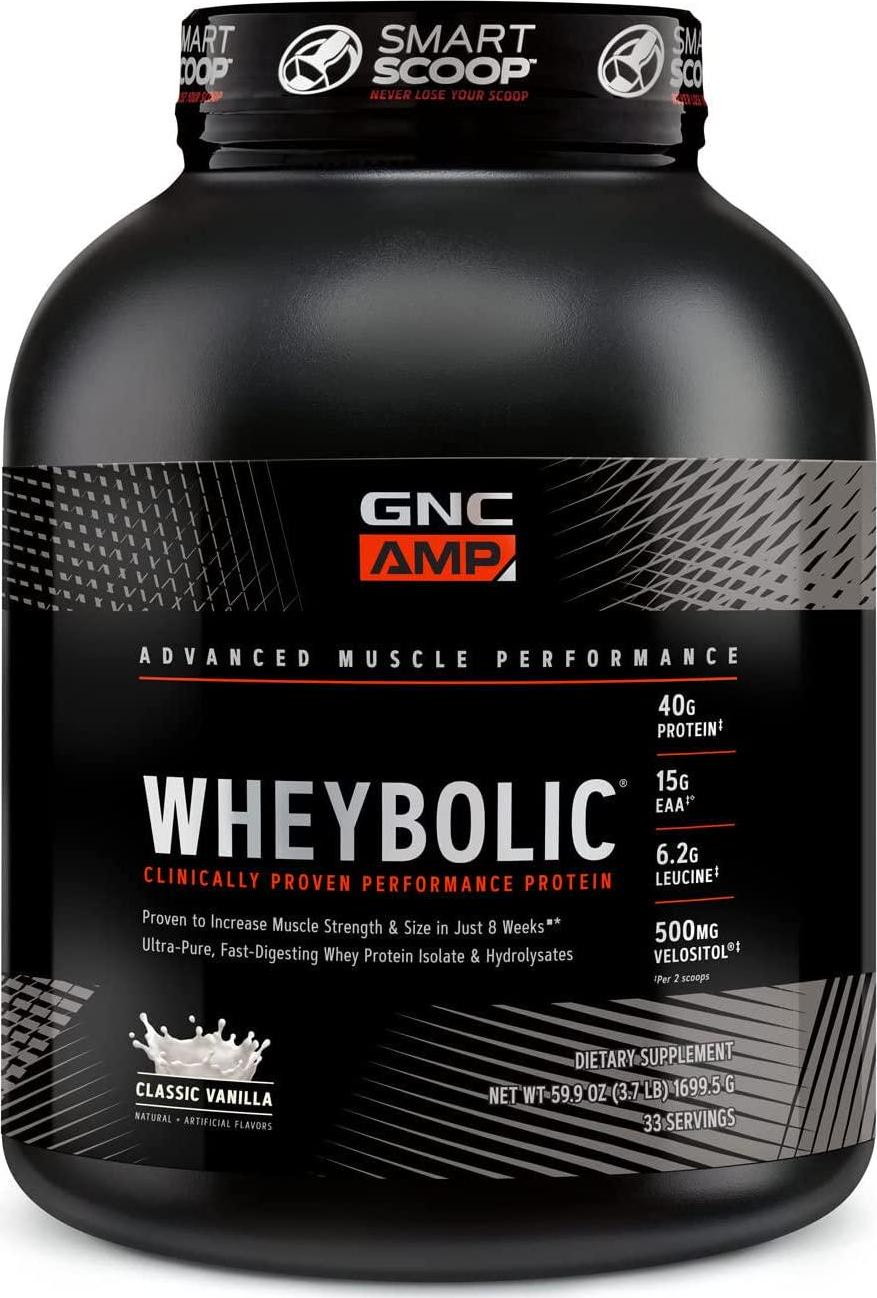 GNC AMP Wheybolic - Classic Vanilla: A Clinically Proven Performance Protein When you need a protein supplement that fits in with your weekly workout schedule, turn to GNC AMP Wheybolic. More than just standard whey protein, this enhanced dietary supplement contains ultra-pure, fast-digesting whey protein isolate and hydrolysates that contribute to muscle growth and recovery^*, as well as improved strength and post-training anabolic response. * Plus, you can use this supplement before or after workouts and cardio, or even on non-training days and between meals, depending on your individual needs. Proven to increase muscle strength and size by 30% in just 8 weeks* Great for use before and after workouts and cardio sessions, as well as on non-training days and between meals Supports strength, performance and stamina*, fuels anabolic muscle support and recovery^* and helps fuel muscles while you recover from intense training^* Enhanced Wheybolic Complex includes 40g of protein, 15g of BCAA, 6.2g of leucine, and 500mg of Velositol. Gluten-free powder supplement with natural and artificial classic vanilla flavor easily mixes into 8 fl. oz. of cold water or your favorite beverage Disclaimers: An 8-week, randomized, double-blind, placebo-controlled study of 33 healthy men compared the effectiveness of this proprietary module of whey protein and leucine vs. an isocaloric carbohydrate placebo consumed before and after resistance training. Subjects consuming the leucine-whey protein supplement experienced greater increases in muscle strength then those on the placebo. Leucine-whey protein supplementation also increased muscle cross-sectional area from baseline. ^When used in conjunction with an exercise program. In an 8-week, randomized, double-blind, placebo-controlled study of 30 healthy male volunteers comparing 1 set resistance training (RT) + active or carbohydrate placebo to 2 sets RT alone with no supplement, the active group showed equal gai