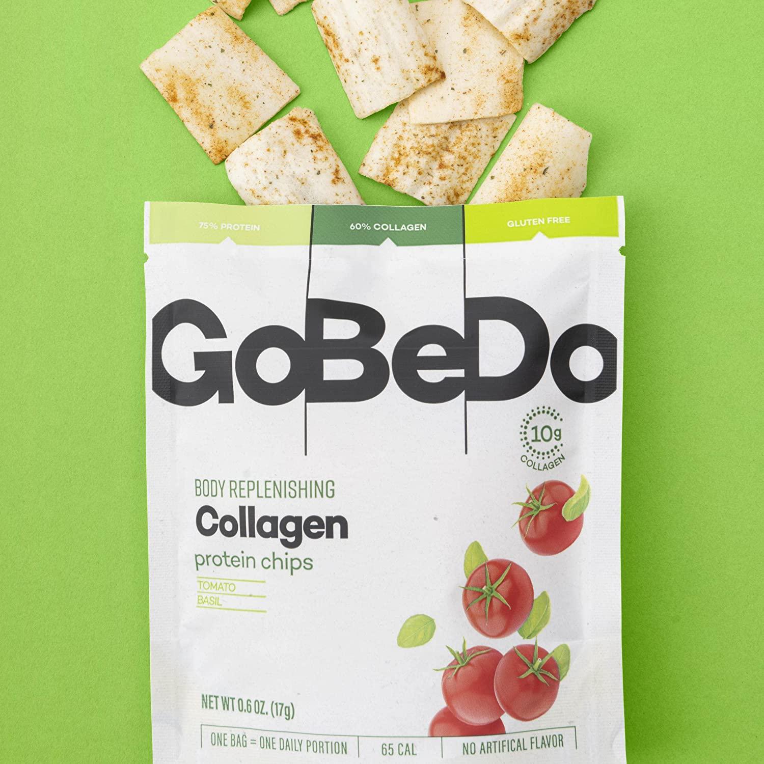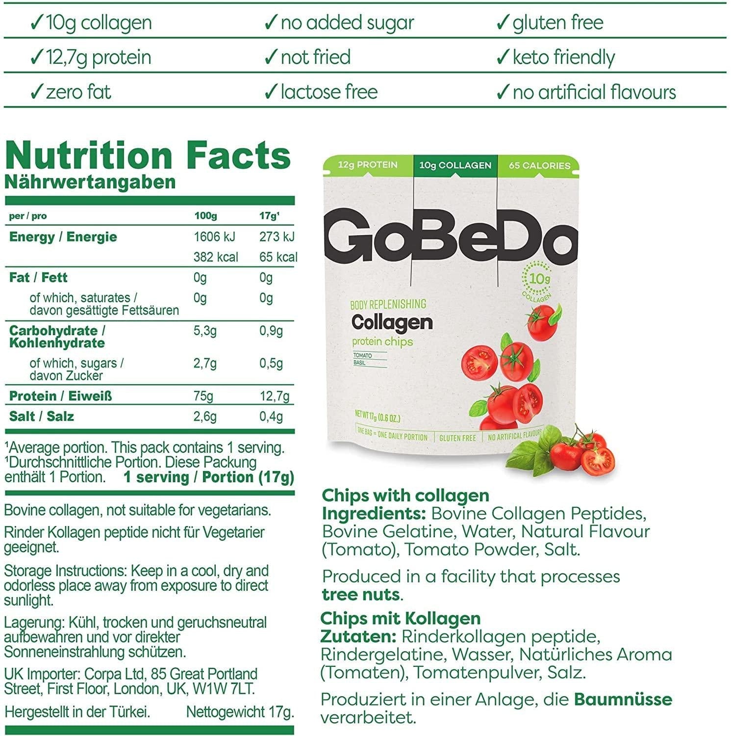 GoBeDo Collagen Chips Tomato and Basil 7 x 17g Bags - Deliciously Healthy High-Protein Chips - Low in Carbs, Sugar and Calories - Gluten-Free Keto Snacks - Supports Skin, Joints, Bones and Hair