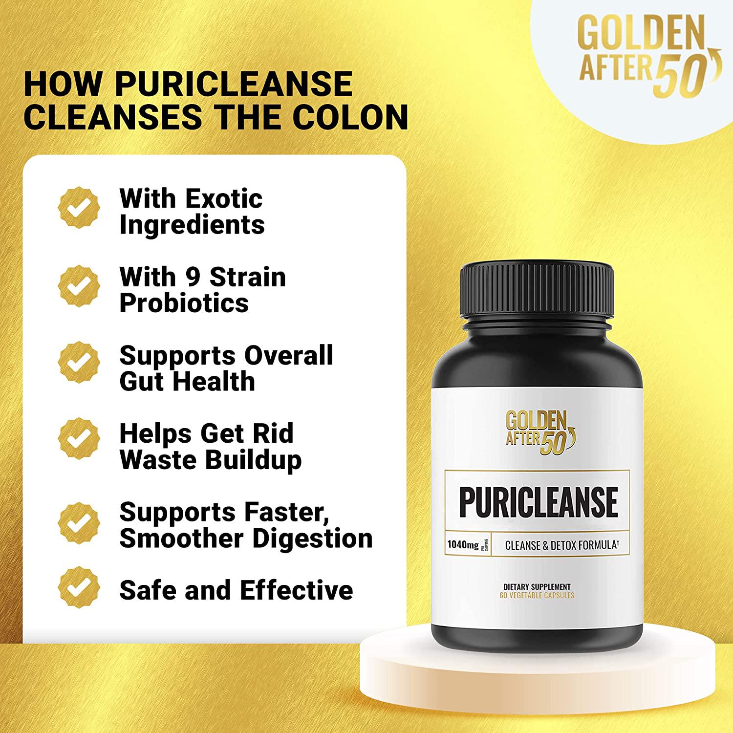 Golden After 50 PuriCleanse - Detox and Colon Cleanse Support - 60 Vegetarian Capsules, 1040mg - with Probiotics, Senna Leaf, and Psyllium Husk - for Gut Cleanse and Bloating Relief for Men and Women