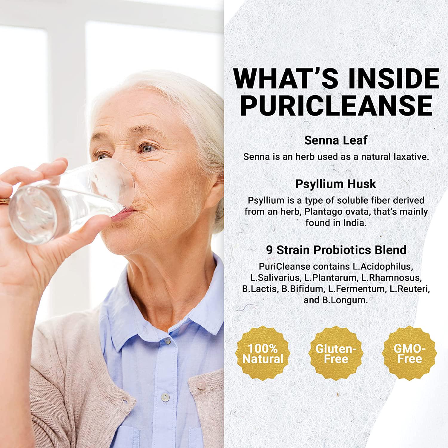 - With 3 Powerful Natural Ingredients: PuriCleanse contains a combination of Senna leaf usually made into Senna tea. It's Mother Nature's natural laxative. Psyllium husk that helps promote regular bowel movement and provides constipation relief for adults. Proprietary blend of 9 strain probiotics for overall gut health.