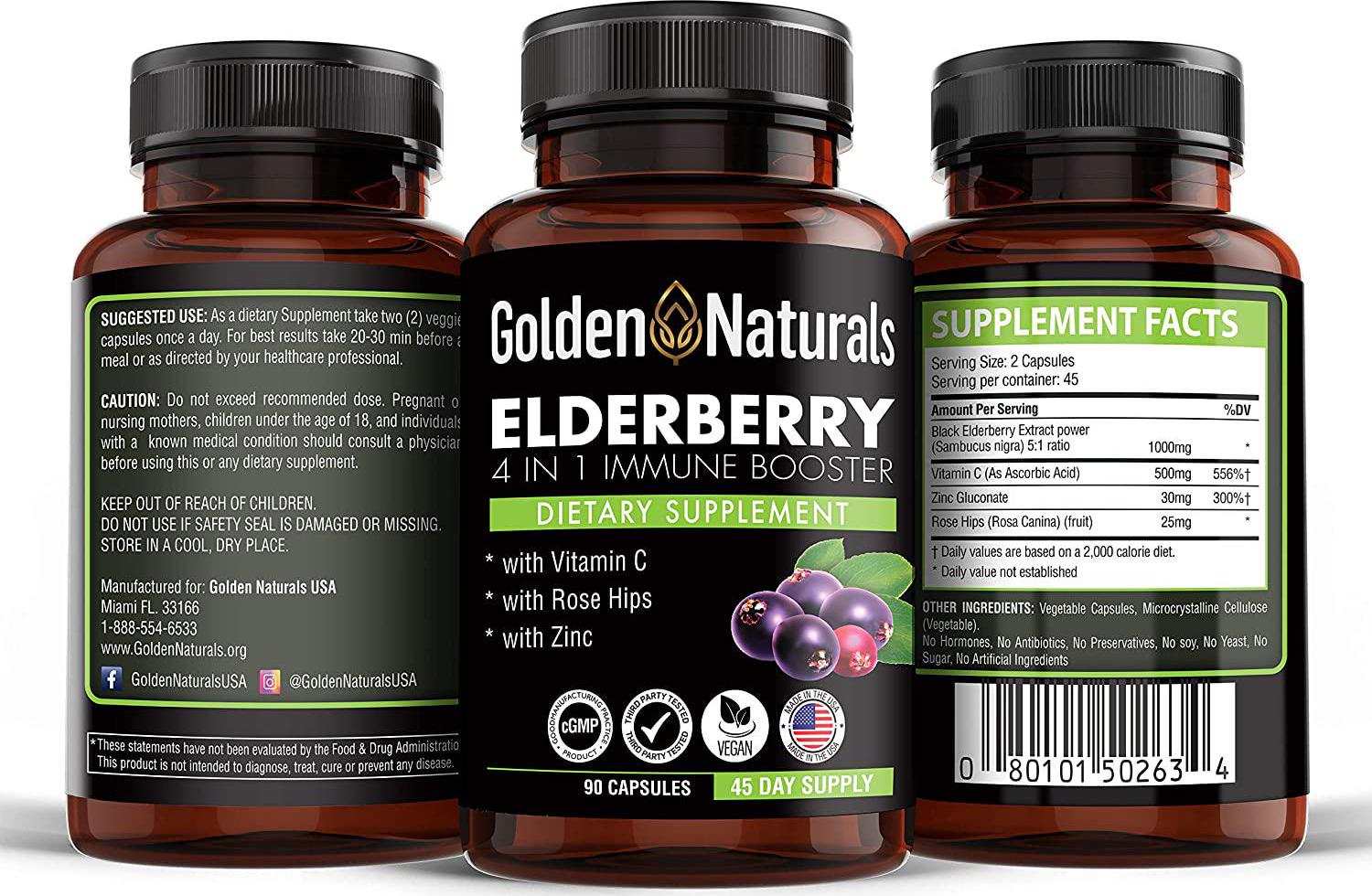Golden Naturals Organic Black Elderberry Extract (Sambucus Nigra) 1000mg 4 in 1 Immune Booster, with Vitamin C, Rose Hips and Zinc, 90 Capsules, Powerful Immune System Support.
