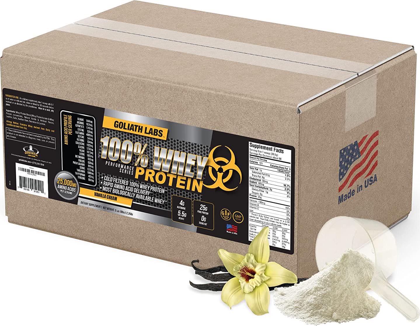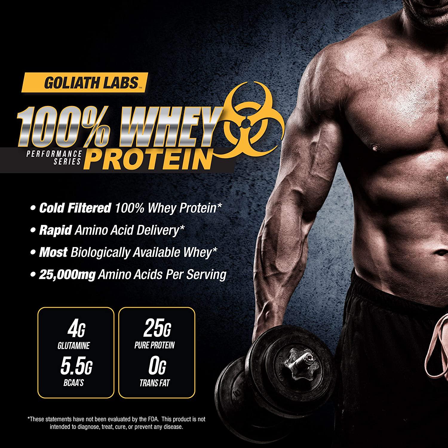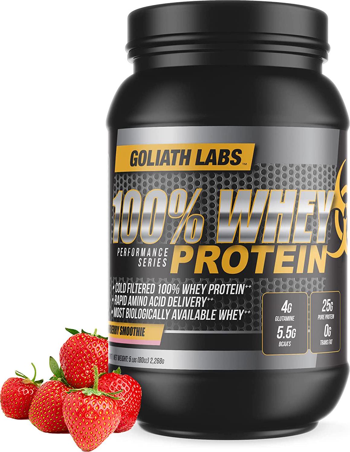 Goliath Labs 100% Whey Protein Powder Isolate/Blend | Fast-Absorbing Workout Supplements for Men and Women | 25g of Pure Protein and 5.5g of BCAAs in Each Serv | Strawberry, 5 lbs, 68 Servings