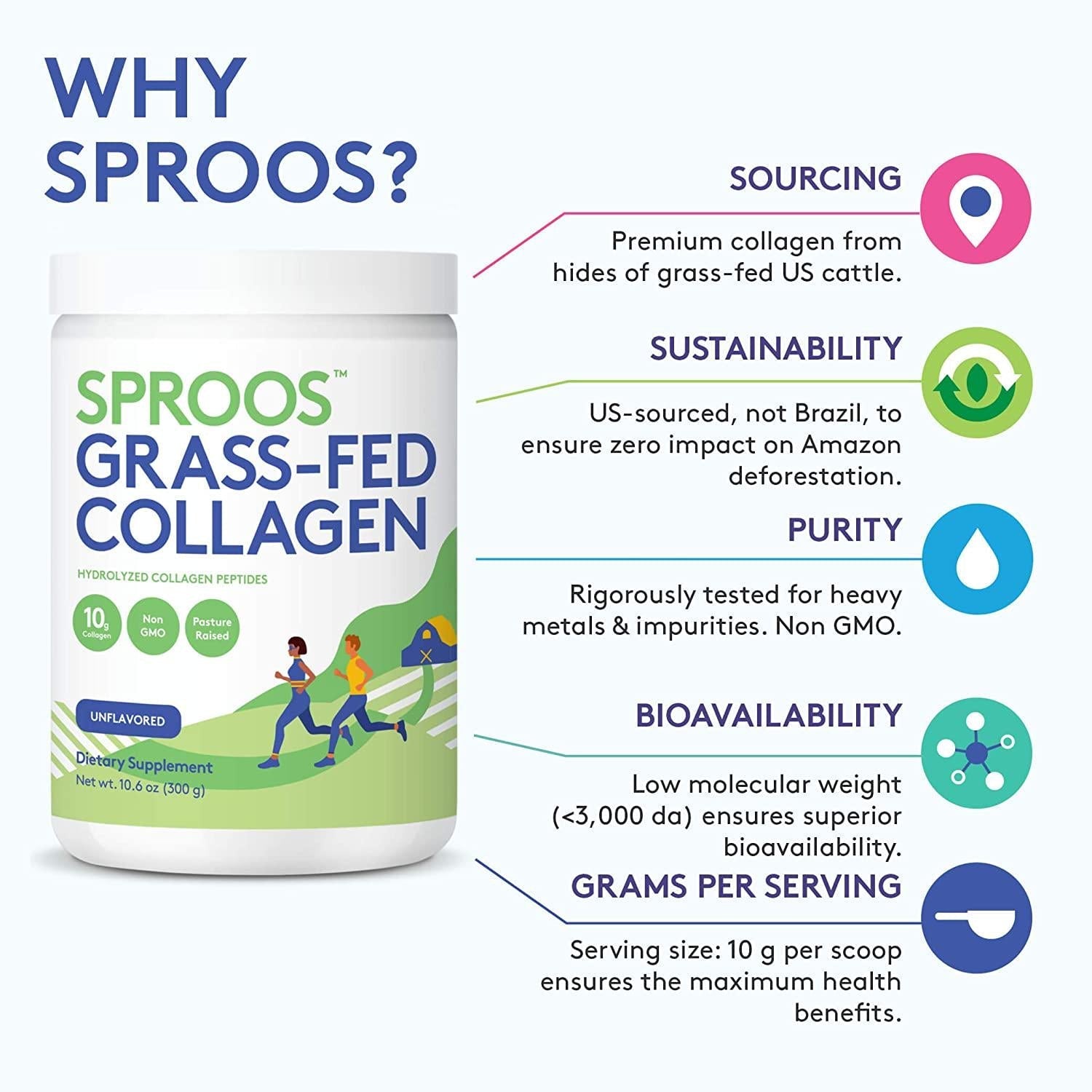 Grass Fed Collagen Powder by SPROOS | Premium Pasture-Raised, Grass-Finished, Non-GMO and Gluten-Free Bovine Collagen Powder | 9g of Protein per 10g Unflavored and Odorless, 10.6 Oz Tub
