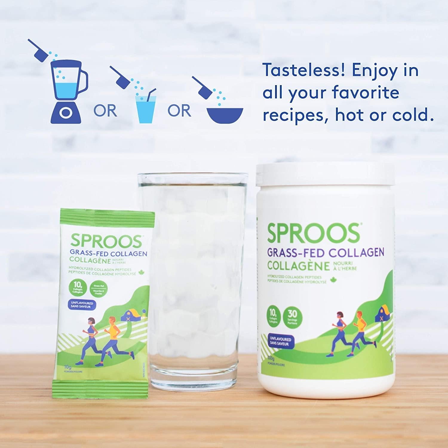 Sproos Premium Grass-Fed Collagen Peptide Powder is highly soluble, digestible and bio-available, meaning it is easily absorbed by the body. It works to restore and rebuild the bodys collagen, countering the effects of natural collagen decline which happens with age. Sproos sources its Grass-Fed Collagen peptides from North American grass-fed, pasture-raised cattle to ensure a natural, sustainable source of this powerful superfood. Collagen is the bodys most abundant protein its found in our skin, muscles, bones, blood vessels, digestive systems and tendons. Sadly, our bodys natural ability to produce collagen wanes with age, which can lead to chronic health issues joint pain, digestive issues, low mood and dull, dry skin. Science is showing that by taking collagen supplements, we can regenerate, repair and strengthen connective tissue. Resulting in global benefits for our entire body. Sproos up your health by adding a grass-fed collagen supplement to your daily routine. Made in Canada.