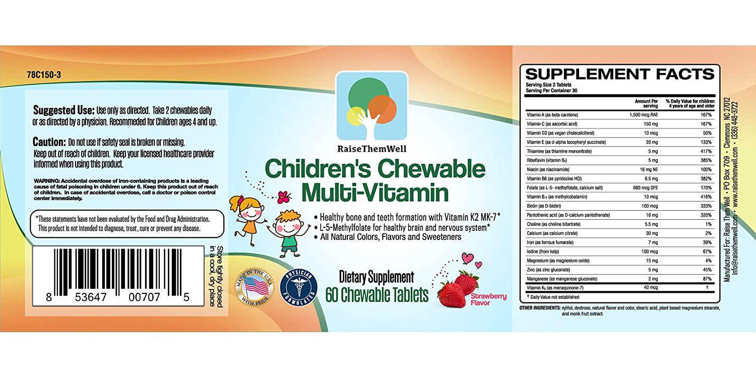 Finally a chewable children's vitamin that tastes great and isn't full of junk. At Raise Them Well our goal has been to produce high quality, natural products for busy families. One of the most common questions we would get is when are you going to make a kid's multivitamin. Well...you have to wait no longer. Our Children's Multivitamin was developed by a physician and uses only the highest quality ingredients and only the most bio-available forms of vitamins. For example we use Vitamin K2 instead of K1, methylfolate instead of folic acid, and methylB12 instead of cyanoB12. We also use only all-natural sweeteners such as xylitol and monk fruit without any sugar. Our kids love the strawberry flavor and we hope your kids will too.