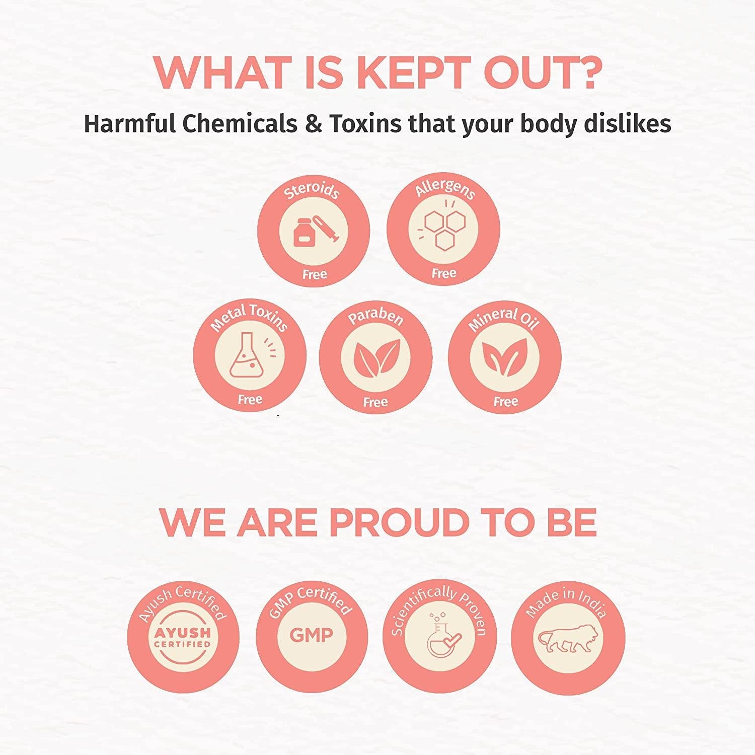 - AYUSH MINISTRY CERTIFIED, INTERNATIONAL STANDARDS OF EFFICACY AND SAFETY - Certified under Ministry of AYUSH . Free of steroids, parabens, metal toxins, allergens and more