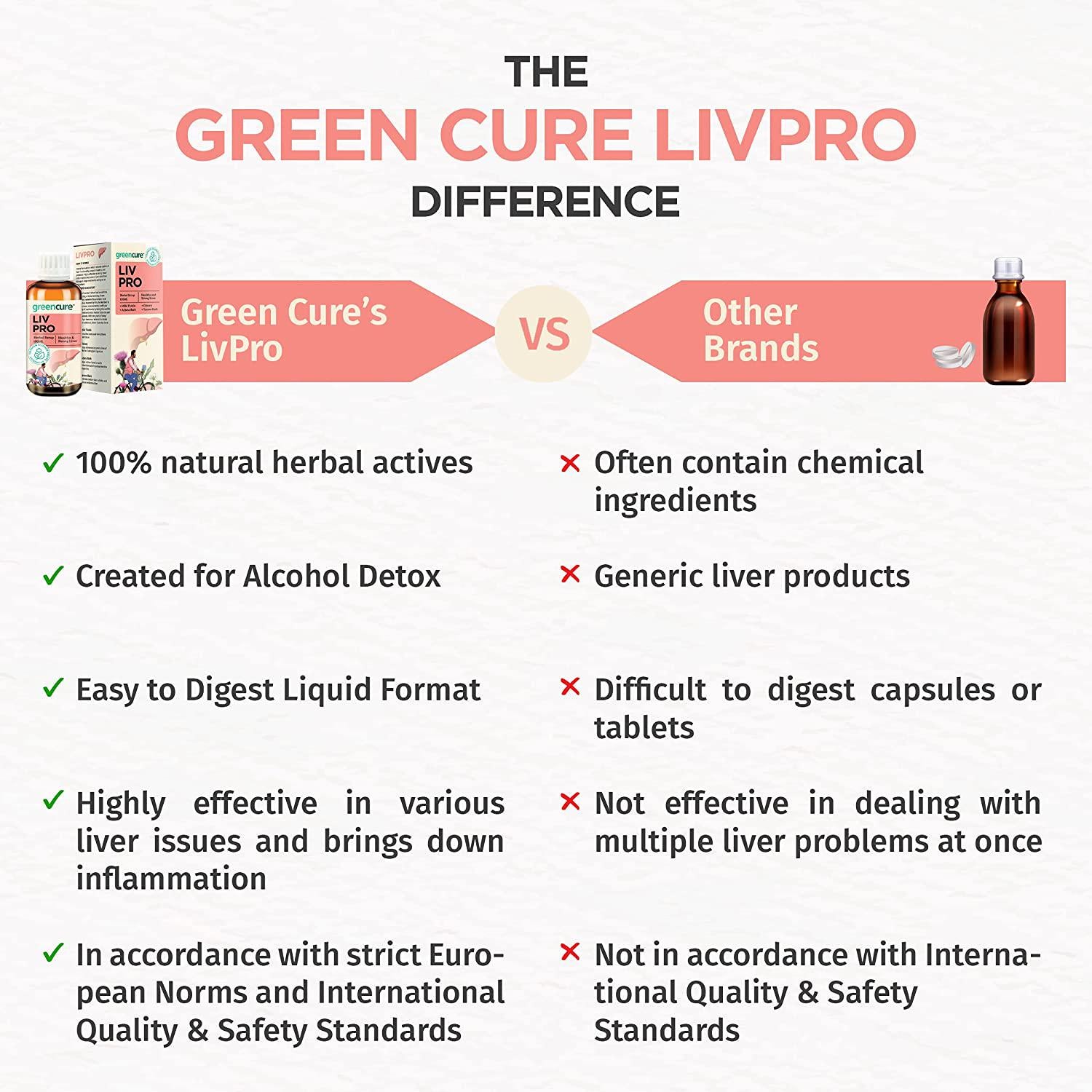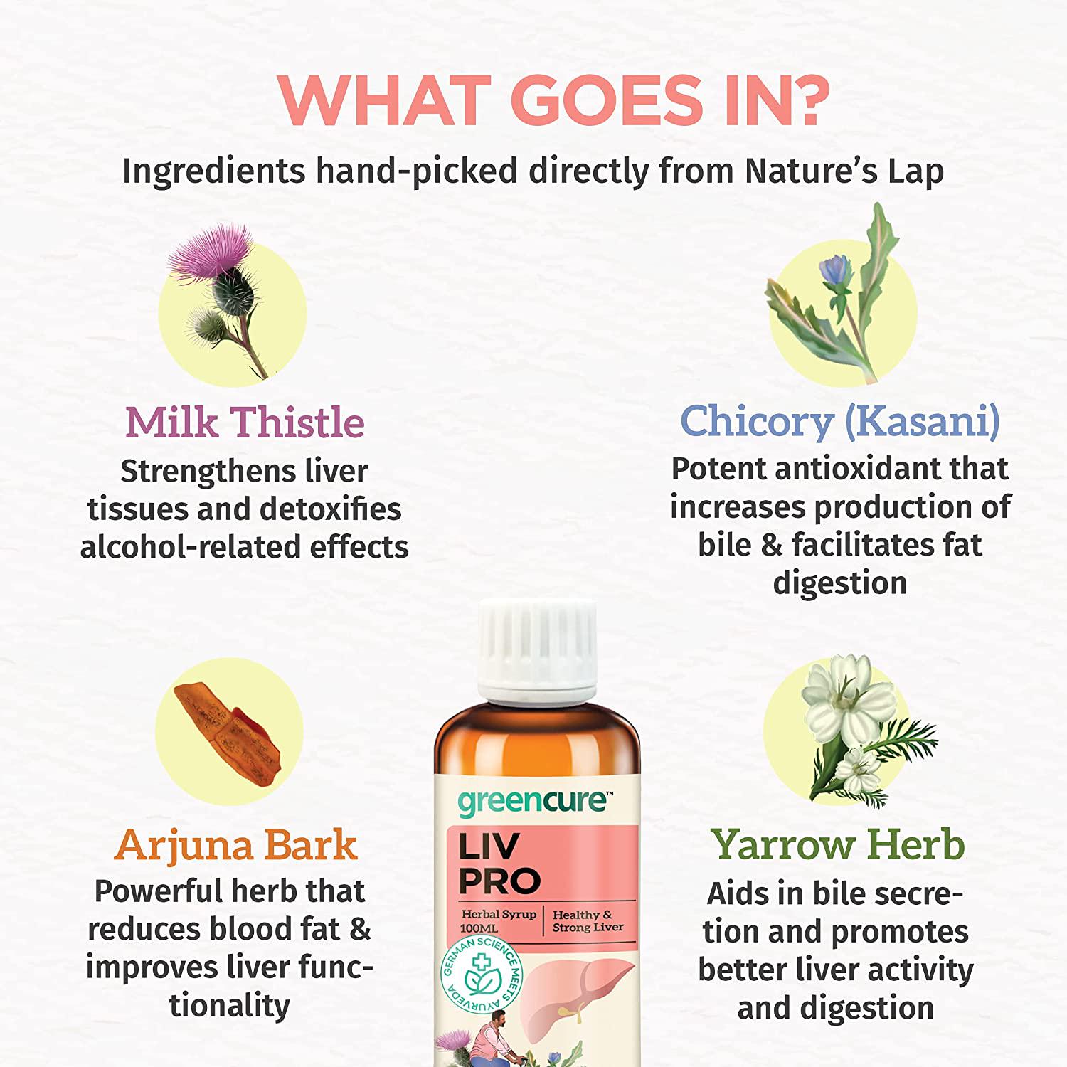Green Cures LivPro is a unique Herbal Alcohol Detox Syrup. Its easy-to-digest liquid format has quick absorption. Livpro is designed with 100% Herbal Ingredients handpicked directly from Natures Lap- Milk Thistle strengthens liver tissues and detoxifies alcohol-related effects, Chicory is an antioxidant that increases the production of bile & facilitates fat digestion, Yarrow Herb aids in bile secretion and promotes better liver activity & digestion and Arjuna Bark helps in reducing blood fat & improves liver functionality. Detox your liver from the harmful toxins and protect it against the effects of alcohol consumption which is a leading cause of liver damage. Having a healthy liver leads to improved digestion, better metabolism, higher energy and improved hormonal balance in the long term. Green Cure is the worlds first brand to combine the Power of German Science with the Wisdom of Indian Ayurveda. All our products are approved by the Ministry of AYUSH and Safe Cosmetics, Australia. We strive for 100% Efficacy and 100% Safety so you dont have to compromise with your health. Our products follow the highest quality production practices and meet international standards. Livpro is a scientifically proven formula that excludes all harmful excipients that may cause side effects for you or your family.