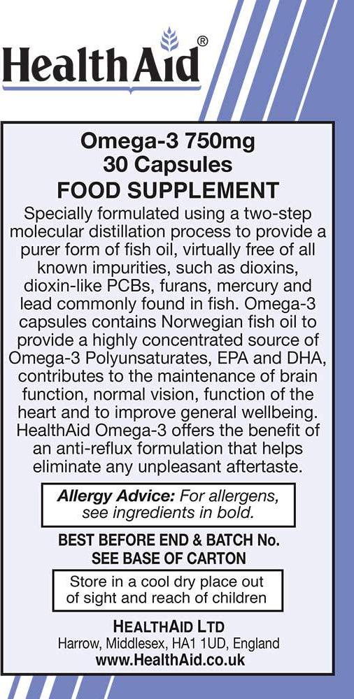 - HealthAid Omega 3 capsules are especially formulated using Norwegian salmon fish oils to give a high concentrated source of Omega-3 Polyunsaturated EPA and DHA in their free form for improved digestibility, assimilation and efficiency