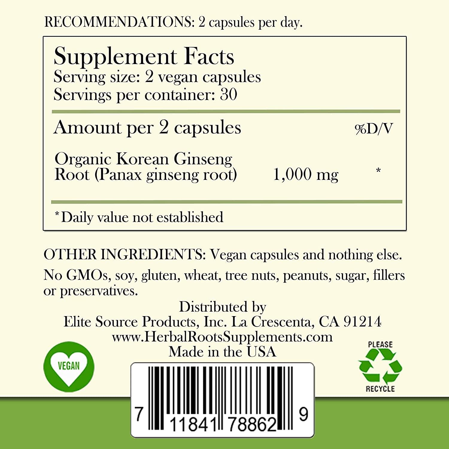 Herbal Roots - Panax Ginseng - Extra Strength 1000mg Supplement - Organic Korean Ginseng Root Powder - 60 Vegan Capsules - High Ginsenosides for Energy, Focus and Performance for Men and Women