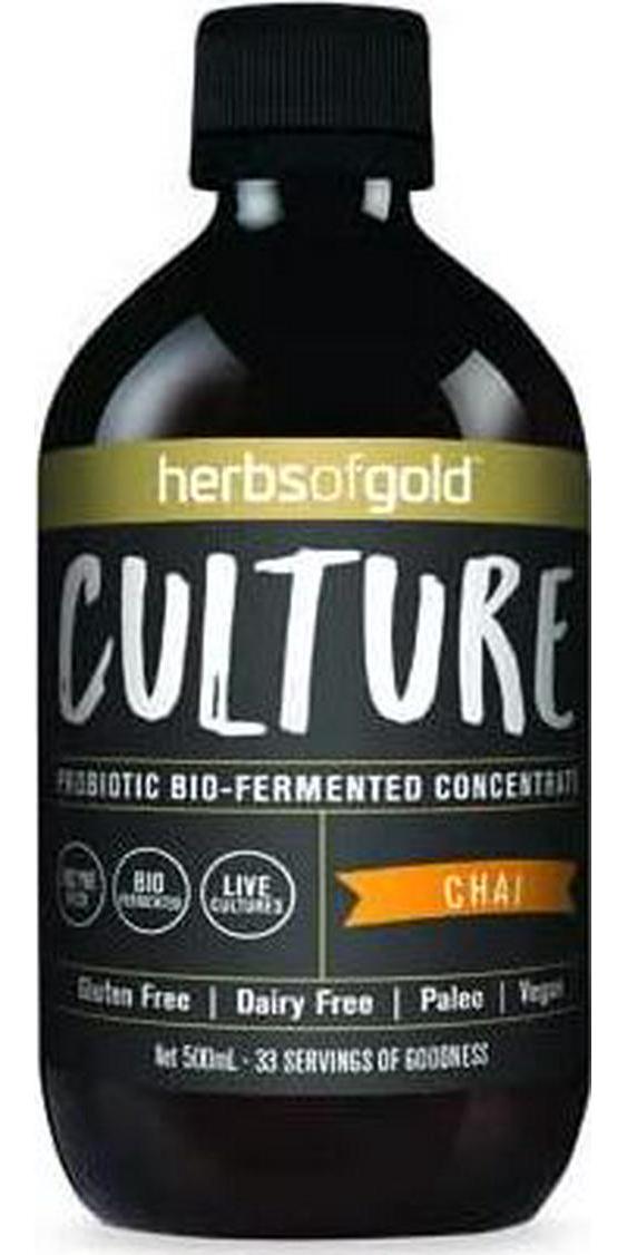 Herbs of Gold Culture Chai recharges the digestive system with 8 live probiotic strains in a bio-fermented base of fruit and delicately blended organic Chai spices. Culture Chai is made using a fermentation process that results in a concentrate full of beneficial enzymes and highly bioavailable nutrients.