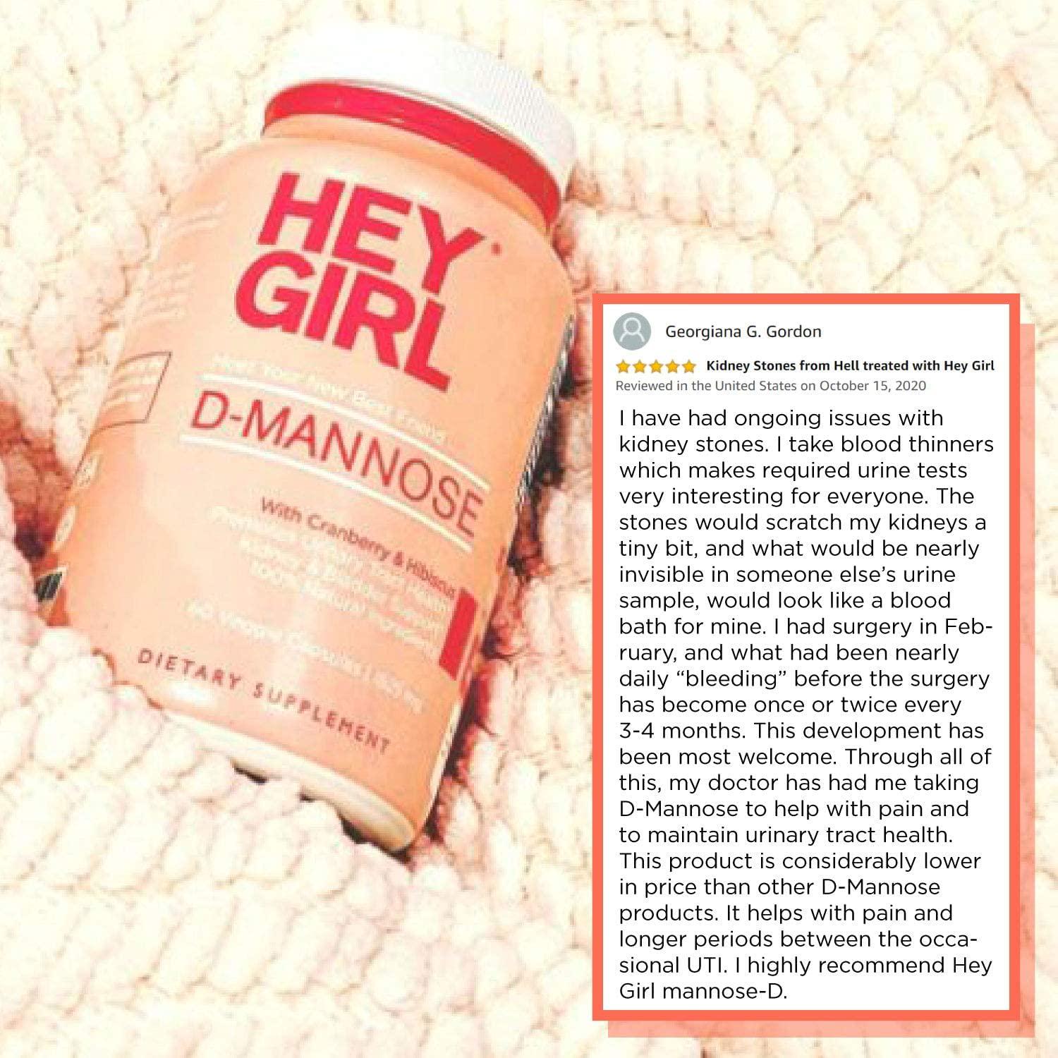 - UTI Life Sucks - Tired of all the trips to the bathroom, sudden need to pee, that sting, and of course that constant worry about when the next UTI will come? That's why we created Hey Girl D-mannose just for you. It's a unique, all-natural blend of key ingredients that are known for cleansing your urinary tract and relieving discomfort. Girl, we want you to stay UTI free! Regain your peace of mind with D-mannose
