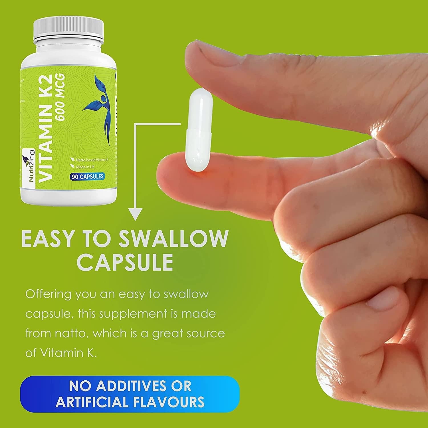 - HIGH STRENGTH: NutriZing’s high potency menaquinone formula provides you with 600mcg. Just one capsule a day will provide you with a great dosage of this important vitamin. Contains only the more effective MK-7 type of vitamin K, than MK4