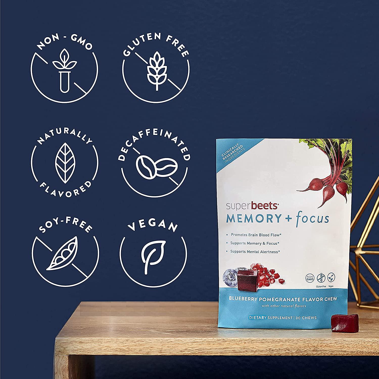 - SuperBeets Memory & Focus Chews include an expert formulated blend of resveratrol, beet root powder, and green coffee extract to support brain blood flow, memory, focus, alertness and overall brain health
