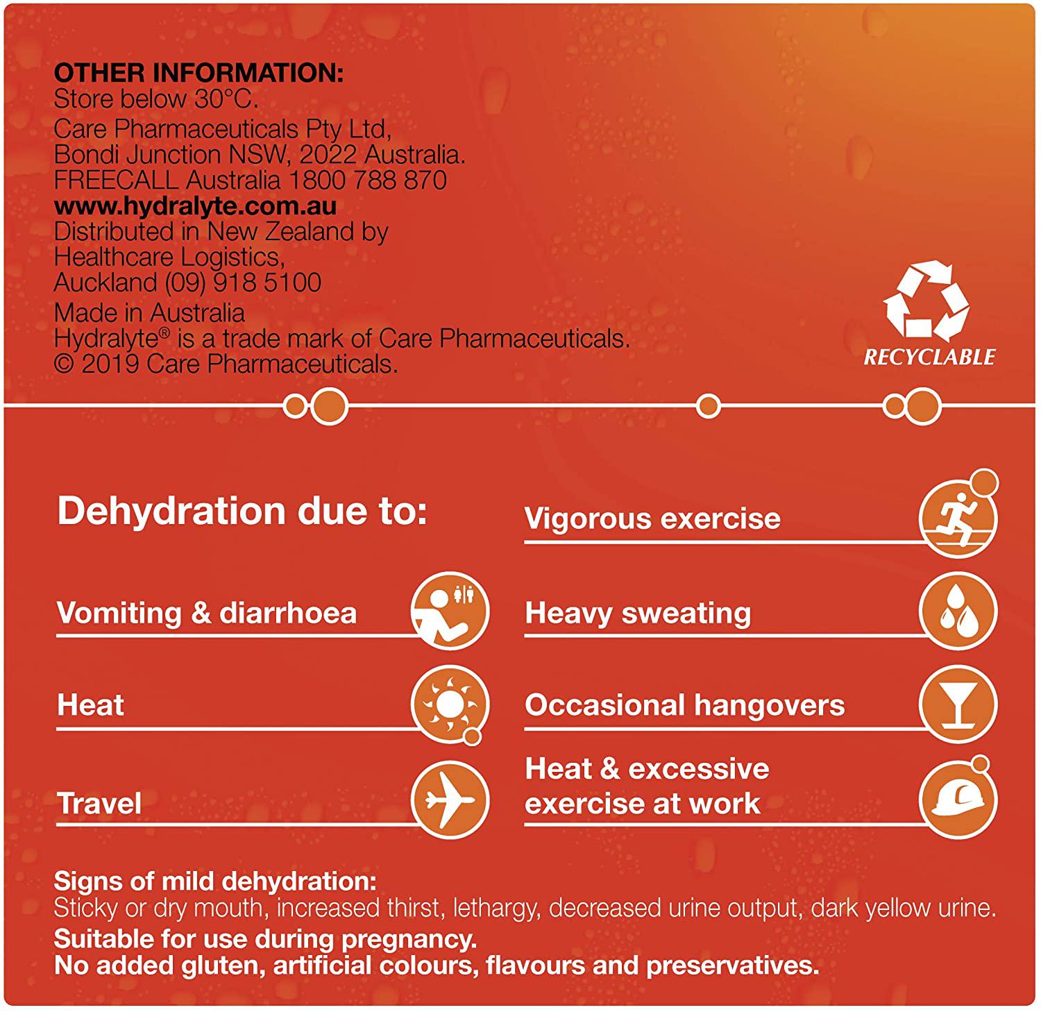 Hydralyte Electrolyte Powder Orange relieves symptoms of dehydration and helps replace water and electrolytes lost due to vomiting, diarrhoea, heavy sweating, vigorous exercise and occasional hangovers.