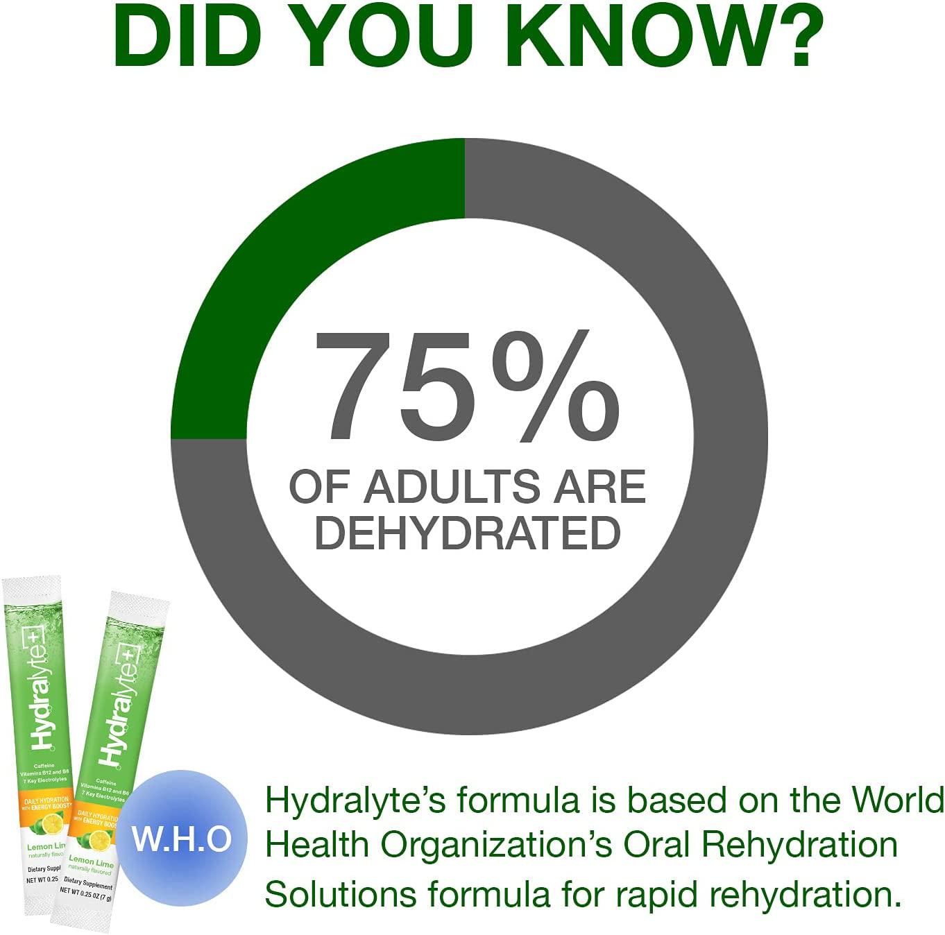 Hydralyte Hydration Plus Energy Boost Electrolyte Powder Packets combine rapid rehydration with an Energy boost. All Hydralyte solutions are scientifically formulated to supercharge your water with the precise ratio of glucose and electrolytes to trigger fast rehydration. We've also added 100mg of caffeine sourced from Green Tea, Vitamins B12 & B6 plus 150% of your daily value of Vitamin C. Convenient and portable, each packet instantly dissolves. Just pour 1 Hydralyte electrolyte stick into 7 fluid ounces of water to kick start your day, fire up your afternoons, or substitute for dehydrating coffee. 75% of adults are dehydrated every day due to lack of water, travel, hot weather, or workouts. Combat dehydration symptoms sleepiness, irritability, muscle cramps, dry mouth, thirst, and headaches. Great to keep in your kitchen draw, gym bag, car, or travel carry-on.