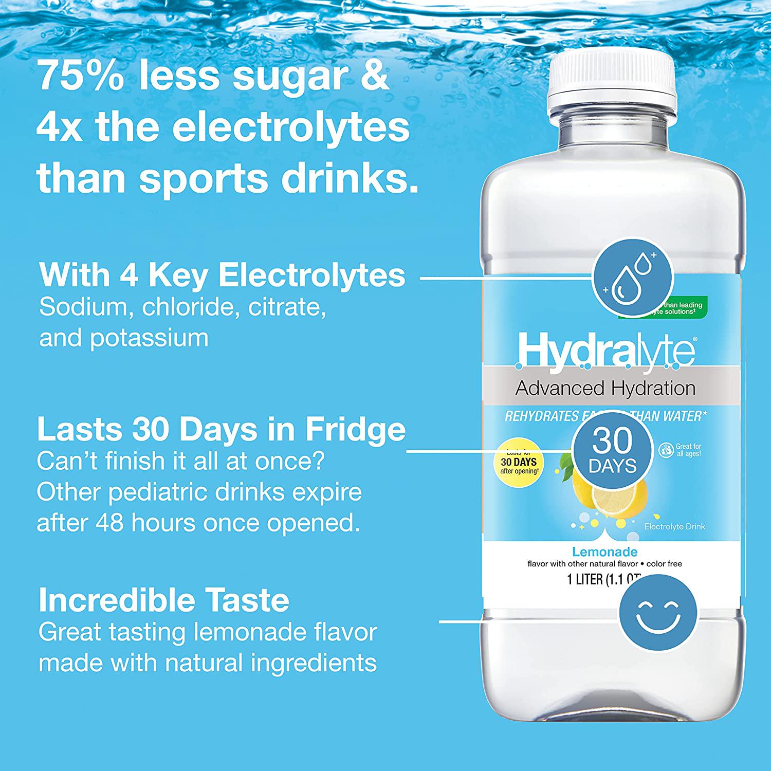 Hydralyte Ready to Drink | Oral Electrolyte Solution | Electrolyte Drink | Pre-mixed | Clinical Hydration Formula for Workout, Cold and Flu, Late Night Recovery | Non-GMO | Lemonade, 1L (33.8 fl oz) Hydralyte Ready to Drink | Oral Electrolyte Solution | Electrolyte Drink | Pre-mixed | Clinical Hydration Formula for Workout, Cold & Flu, Late Night Recovery | Non-GMO | Lemonade, 1L (33.8 fl oz)