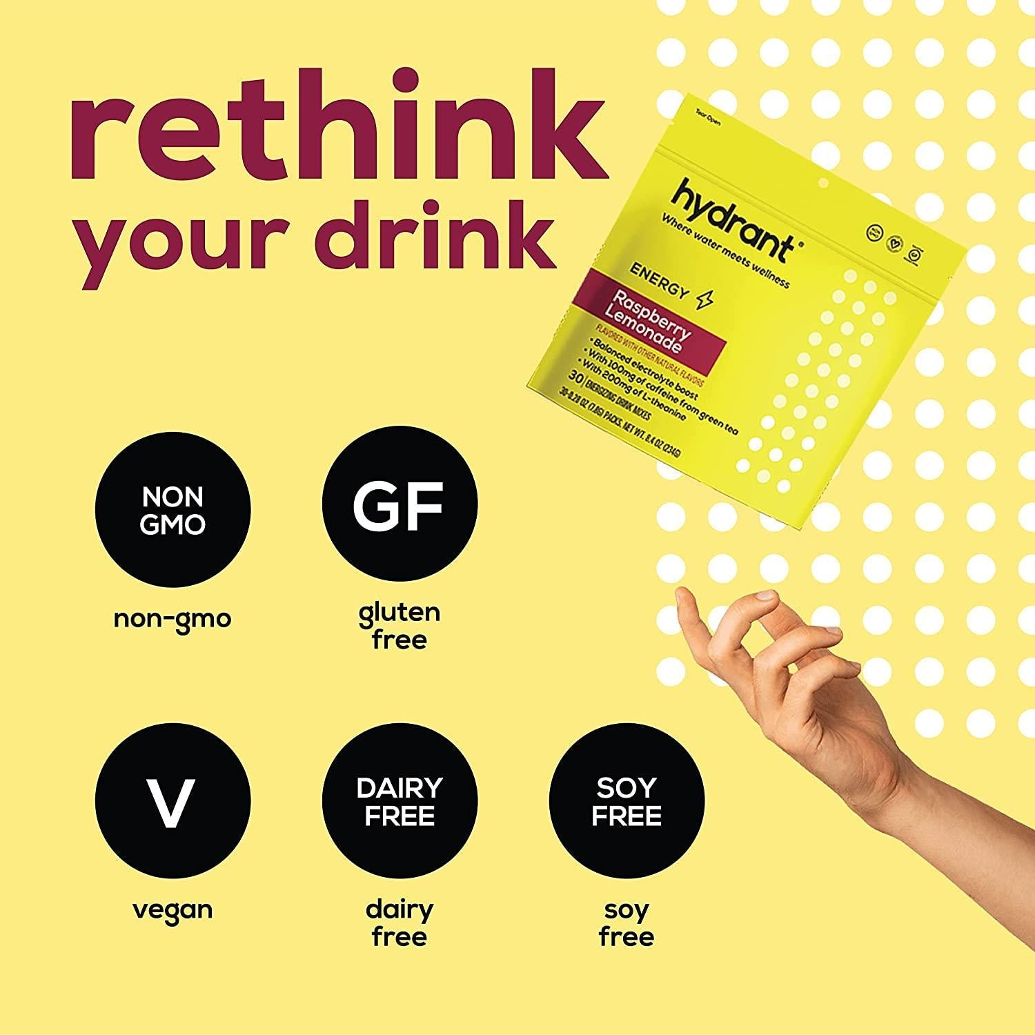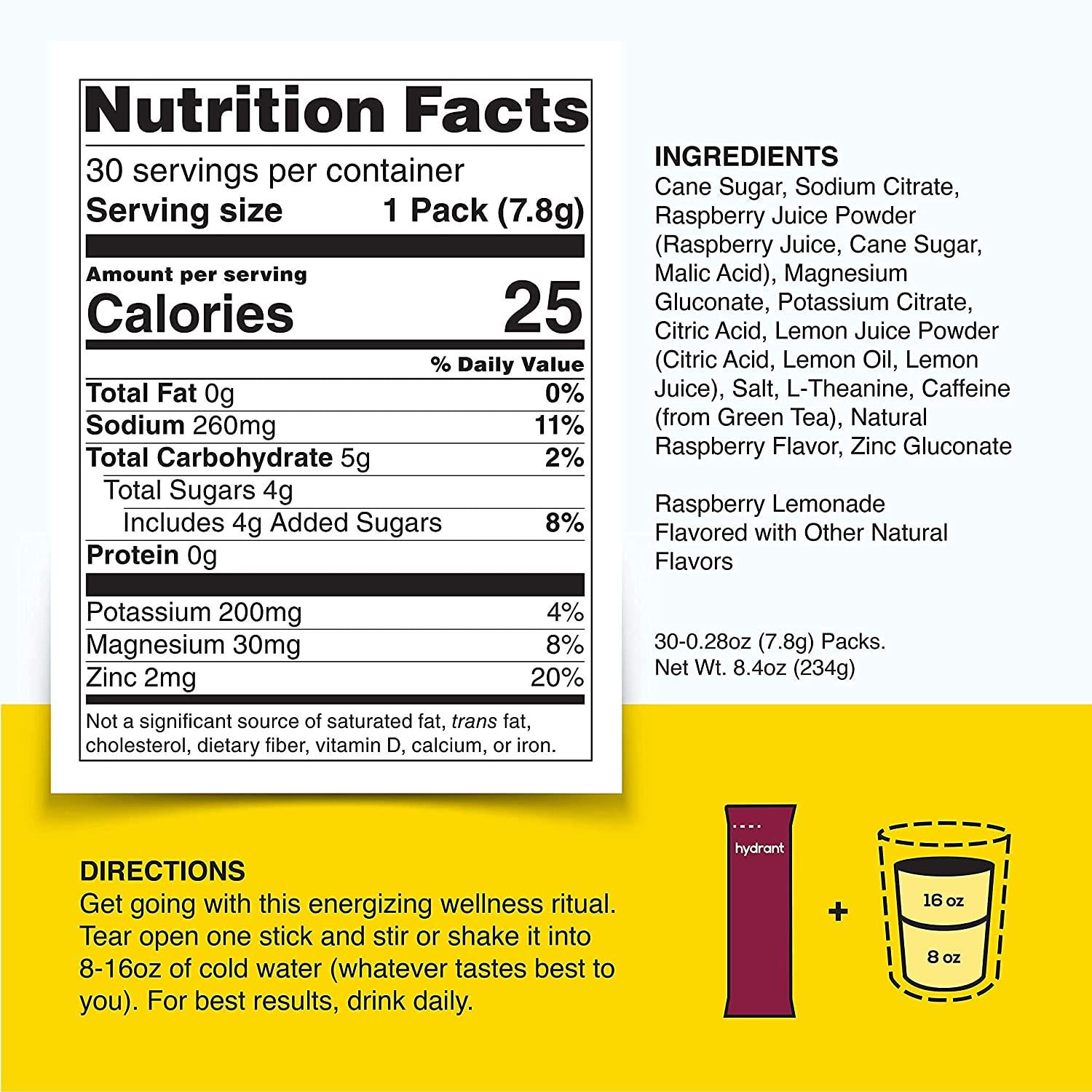 Hydrant Energy 30 Stick Pack, Caffeine and L-Theanine Rapid Hydration Mix, Electrolyte Hydration Powder Packets with Zinc (Raspberry Lemonade, 30 Count (Pack of 1))