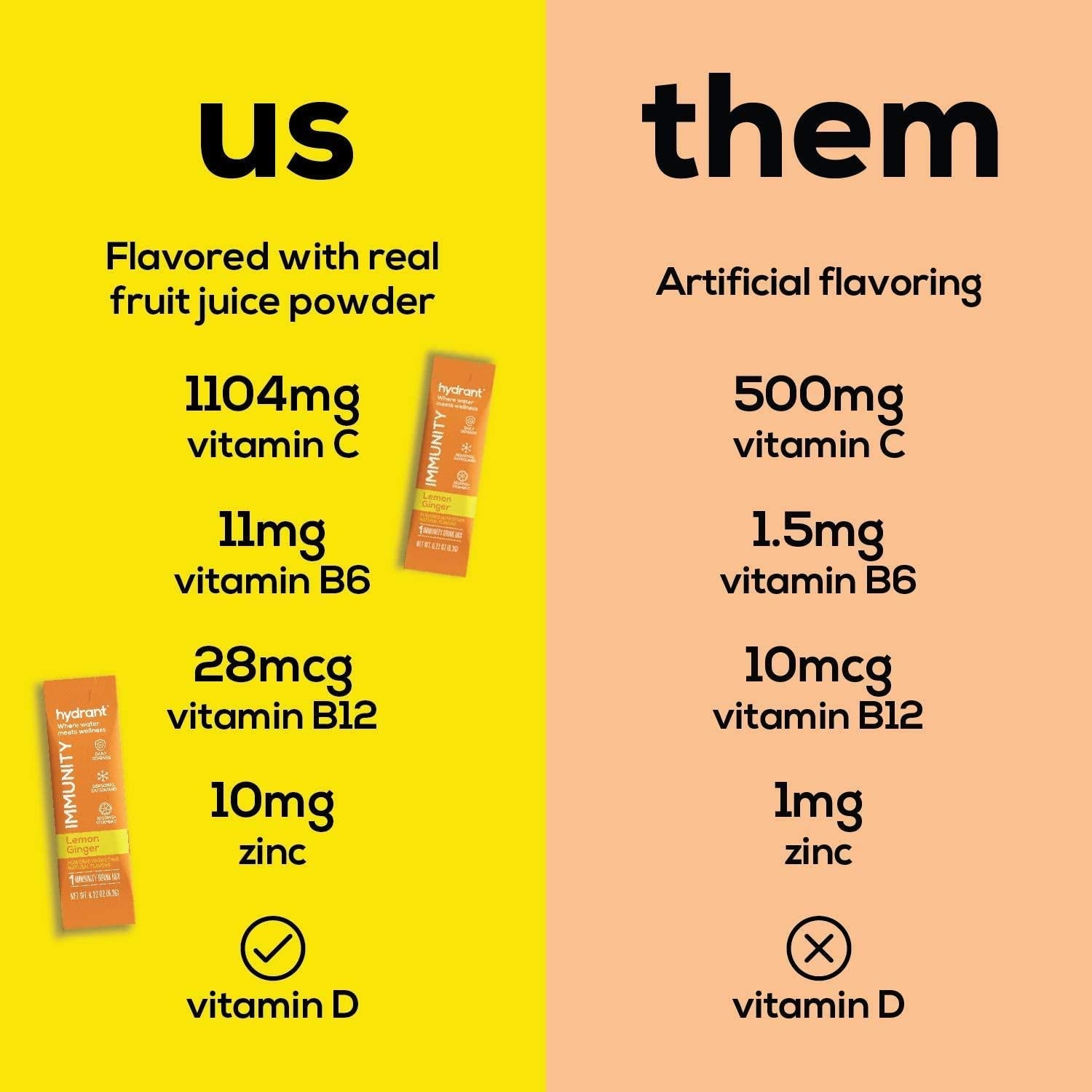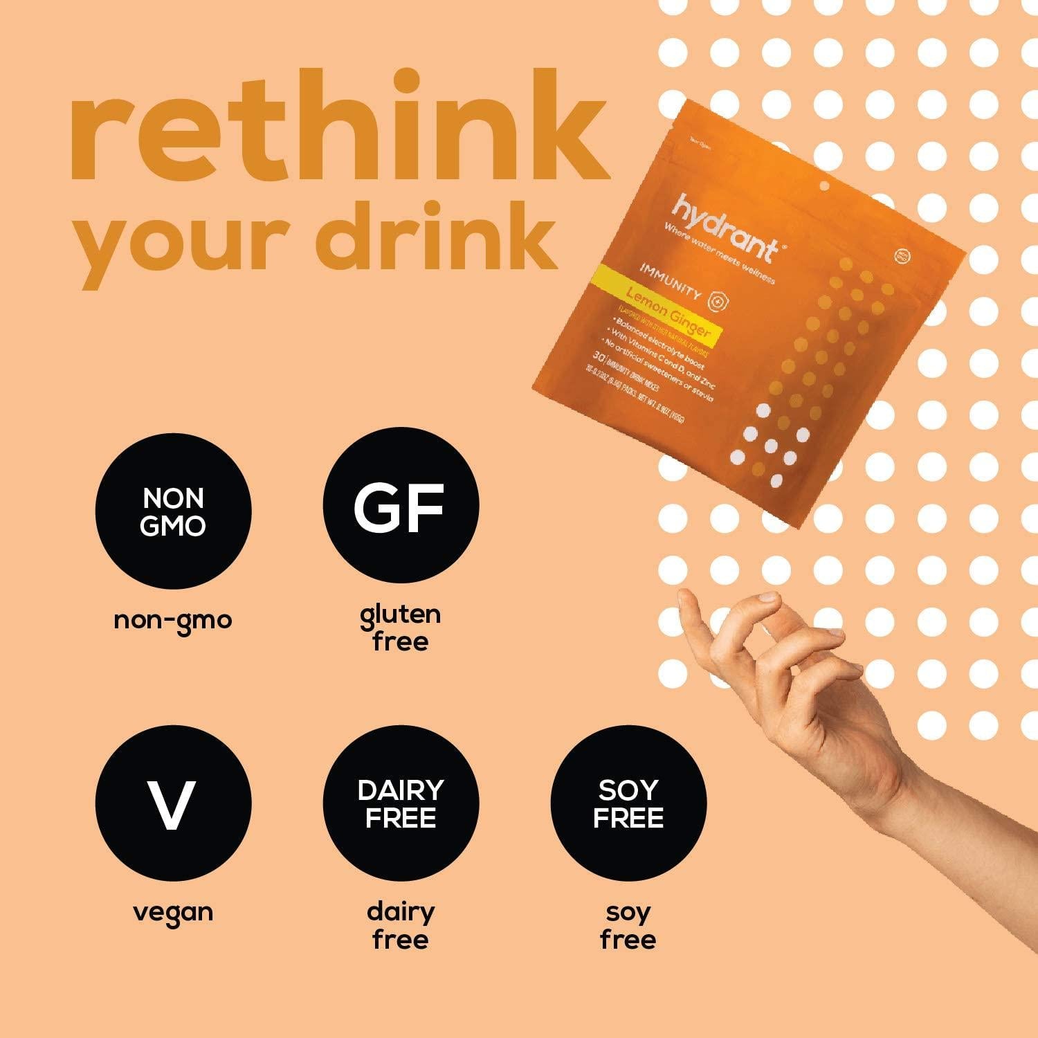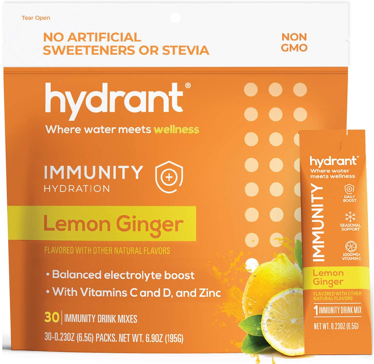 Hydrant Immunity Vitamins Electrolyte Powder - Supplement with Vitamin C, B12, B6, Zinc - Immune, Hydration, and Energy Support Hydration Powder Stick Packets (Lemon Ginger, 30 Count)