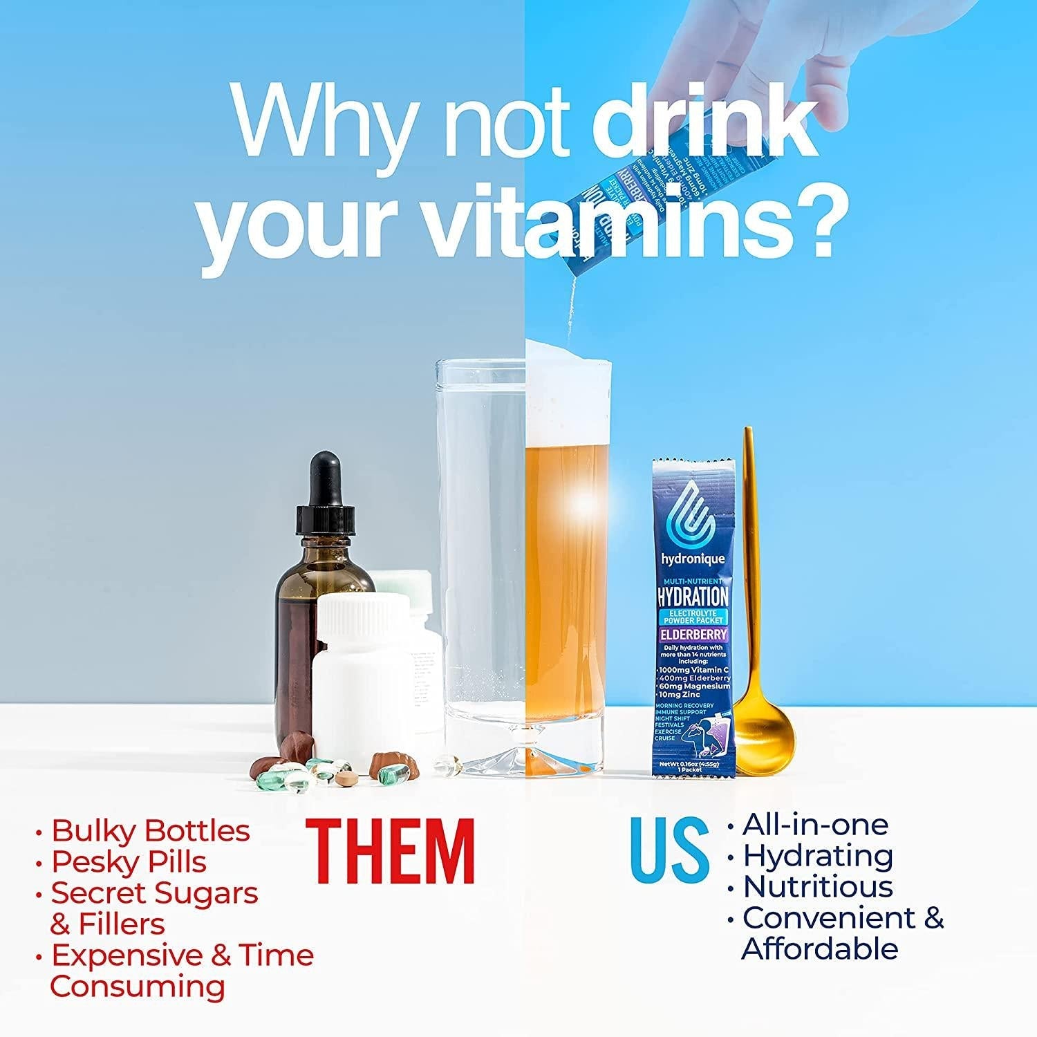 Hydronique Hydration Packets Sugar Free | Low Sodium Electrolytes Powder | Travel, Rehydration, Immunity | Vitamins, Minerals, Antioxidants | Elderberry Flavor (30 Packs)