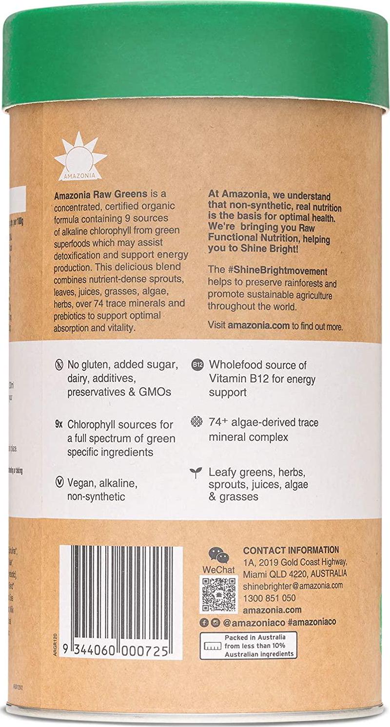 ia Raw Prebiotic Greens has been created to help you feel your best. There are several types of chlorophyll (green pigments) that promote alkalinity, assist detoxification and enhance energy, which is why it is so important to consume an array of different greens. The delicious formula combines nutrient-dense sprouts, leaves, juices, grasses, algae, herbs and natural sea mineral to create the most comprehensive green-specific formula on the market. Highly nourishing and created at low temperatures to preserve the enzymes. It is designed to support your vitamin, mineral and phytonutrient intake so that you feel clean and energised every day. Available in 600 g jar.