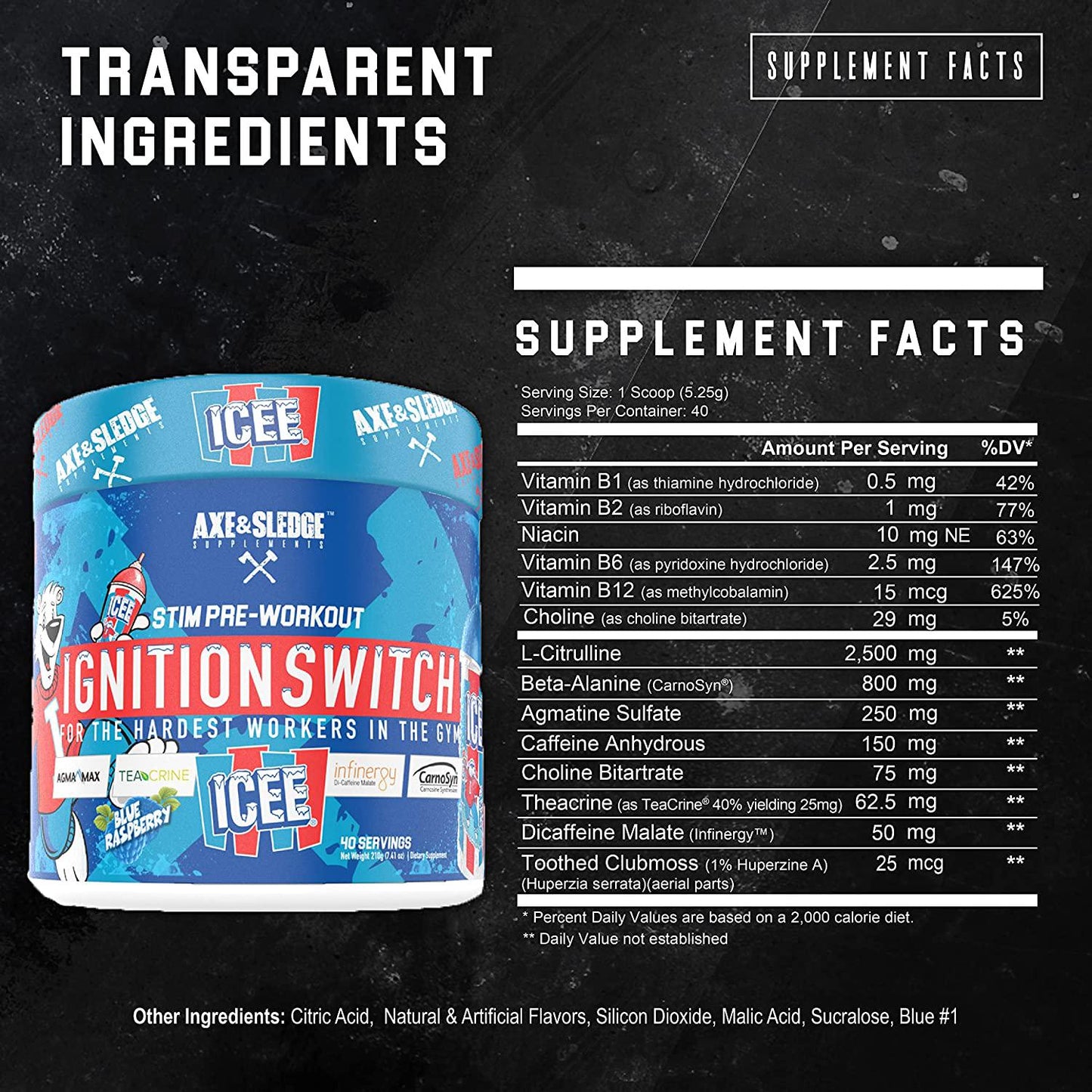 Ignition Switch Pre-Workout with CarnoSyn, TeaCrine, Infinergy, and AgmaMax, Long Lasting Energy, Laser Focus, Increased Pumps, Enhanced Performance, 40 Servings, ICEE Blue Raspberry