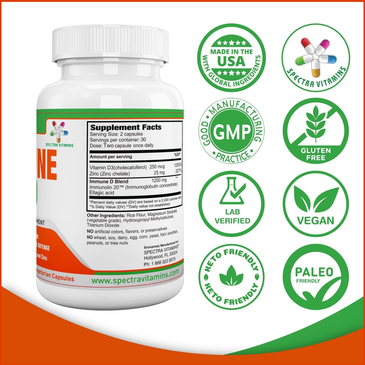 IMMUNOLIN ENHANCE IMMUNITY: IMMUNE D Support Supplement features potent levels of ImmunoLin, ImmunoLin is the next generation immuno-protein, providing concentrated immunoglobulins to enhance the bodys natural immune defenses. Made with specifically purified serum proteins, ImmunoLin contains high concentrations of immunoglobulins and growth factors to support immune health, digestive wellness, and sports nutrition. OTHER SUPPLEMENTS: Vitamin D3, Zinc, and Ellagic Acid to help strengthen the bodys defenses to keep you protected year round with extra immunity support. PROMOTES ANTIOXIDANT ACTIVITY.IMMUNE D has powerhouse antioxidant ingredients that not only includes Zinc which remove toxins from your body and help fight off free radicals that can damage cells and impact immune health. But also IMMUNOLIN and other ingredients that help to support immune function and muscle health. SPORTS NUTRITION: Boosting recovery speed and protecting muscle tissue are priorities for recreational and competitive athletes a. COLD & FLU SUPPORT: Our supplement contains necessary ingredients required for proper functioning of your immune system to fight with infections and diseases. CERTIFIED PRODUCT: IMMUNE D capsules are made in the USA in a GMP certified FDA registered facility. Each capsule is made up of Non-GMO Ingredients. For maximum results include IMMUNE D capsules one capsule twice daily in your daily diet and try it for minimum 1 week
