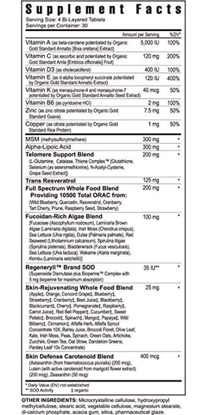 - Vitamin A, Vitamin C, Vitamin D3, Vitamin E, Vitamin K, Vitamin B6, Zinc, Copper, MSM, Alpha-Lipoic Acid, Telomere Support Blend, Trans Resveratrol, Full Spectrum Whole Food Blend, Fucoidan-Rich Algae Blend, Regeneryll Brand SOD, Skin-Rejuvenating Whole Food Blend, Skin Defense Carotenoid Blend, Microcrystalline cellulose, hydroxypropyl methylcellulose, stearic acid, vegetable cellulose, magnesium stearate, di-calcium phosphate, acacia gum, silica, pharmaceutical glaze.
