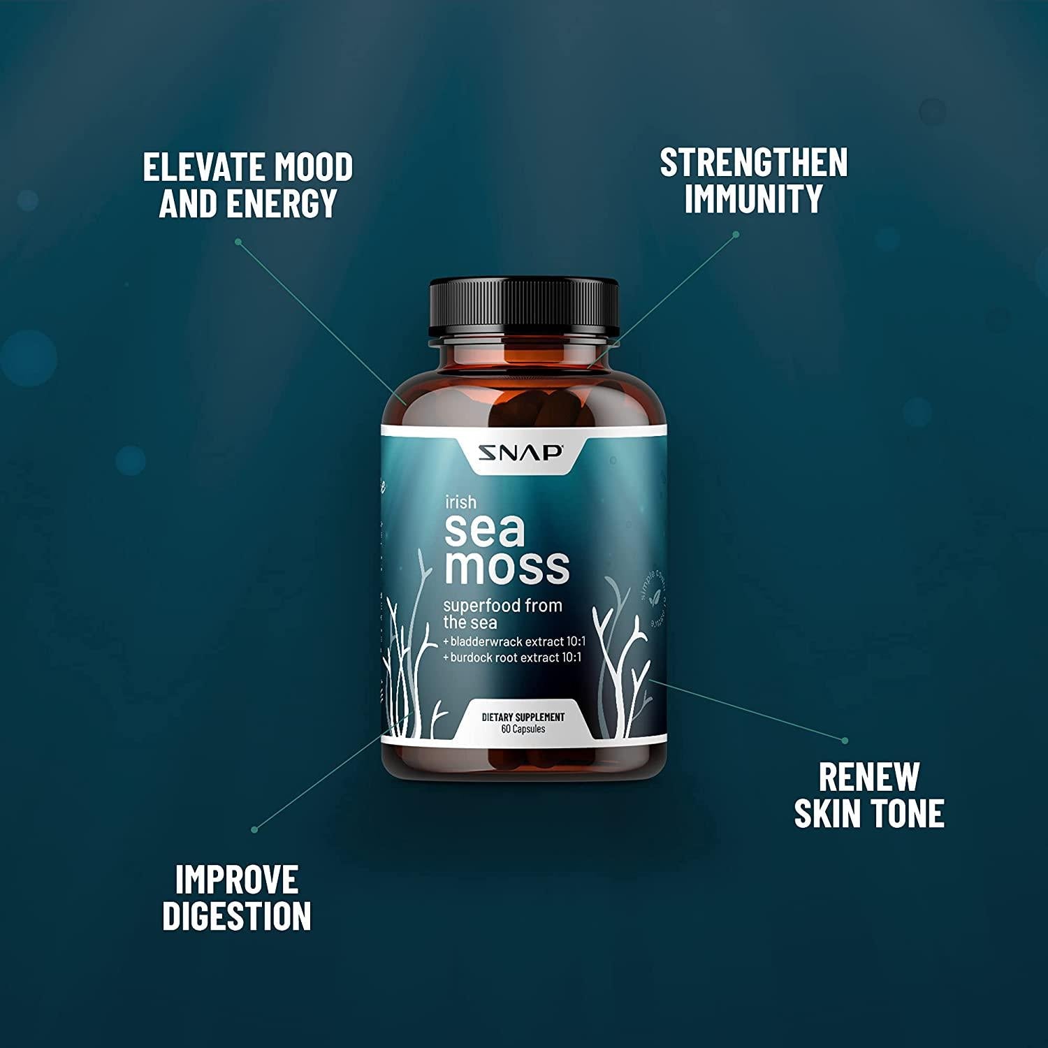 - IMPROVE DIGESTION: Potent pre-biotic seamoss pills feed healthy gut bacteria for a soothed digestive tract and better bladder without bloating or constipation. The seamoss bladderwrack burdock makes for a perfect superfood combination for metabolism and energy production.