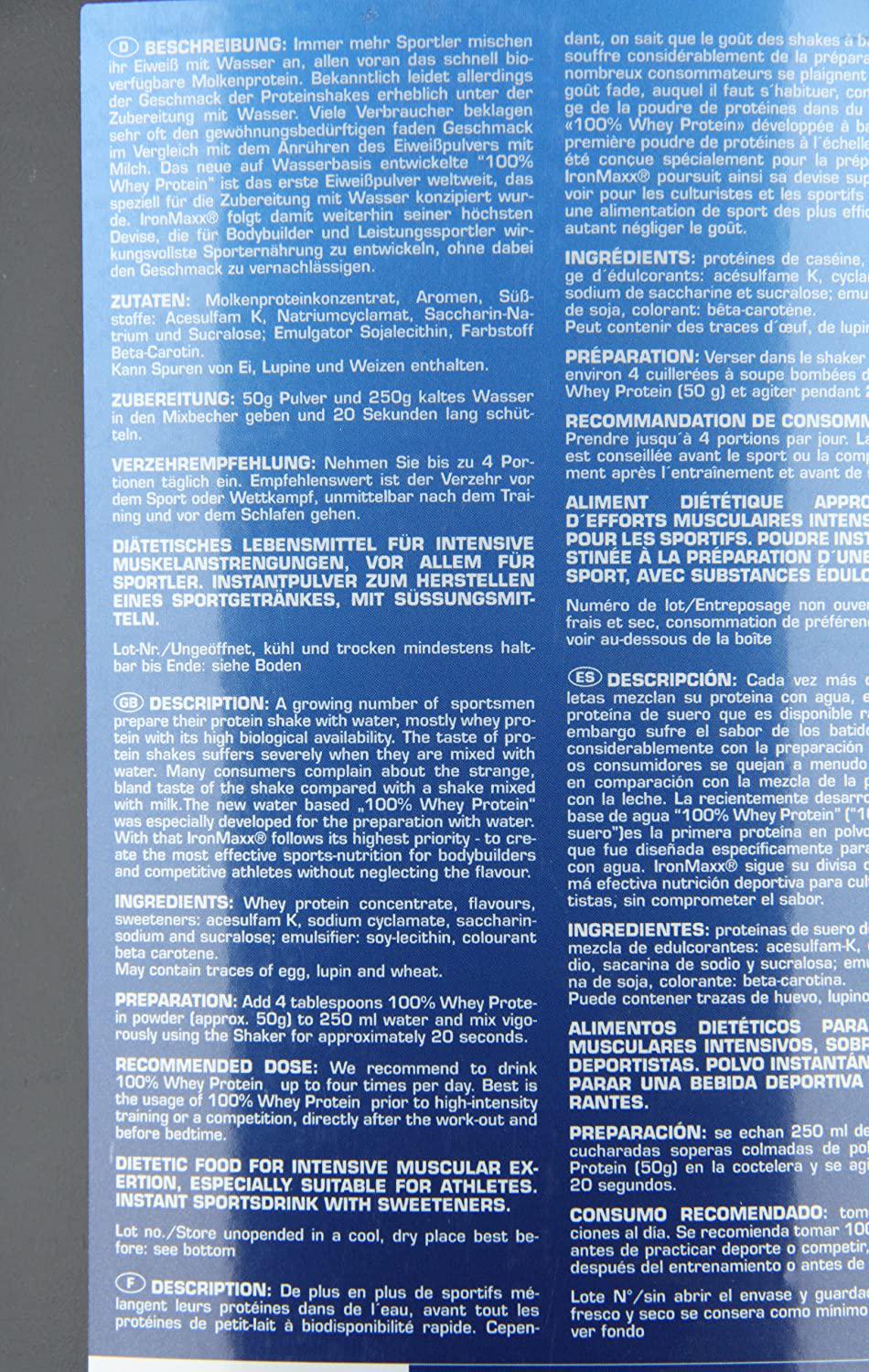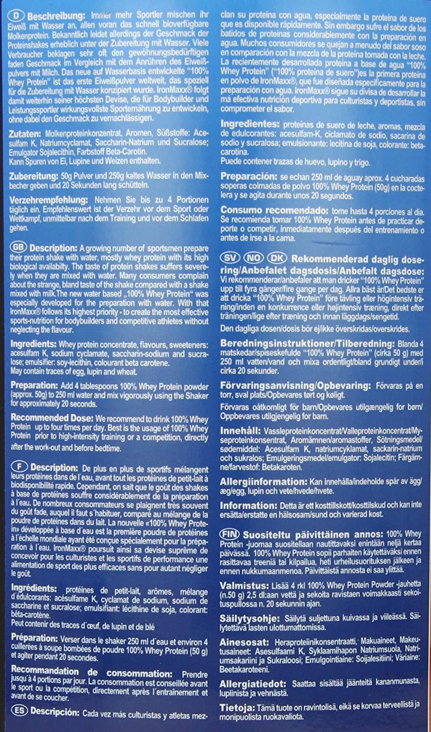 The new 100 percent whey protein more than fulfils this requirement and was developed especially to be prepared with water. IronMaxx's new whey protein doesn't only taste great when it's mixed with water. Its nutritional value is also very high. Each portion of 100 percent whey protein provides 38.5g of pure, quickly exploitable whey protein with very low levels of fat, cholesterol and lactose. It's the ideal protein for after training and effectively supports the body's muscle growth and muscle regeneration. Melon flavour. Available in 2350 gram.
