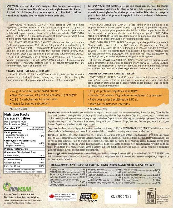 Iron Vegan Athlete's Gainer was designed with the most ingredient conscious athlete in mind. Each serving provides 42 grams of non-GMO plant based protein derived primarilhy from fermeted pea protein isolate and organic sprouted brown rice protein concentrate. Iron Vegan Athlete's Gainer is an excellent source of dietary protein which helps to build strong muscles and repair body tissues. Bur Iron Vegan Athlete's Gainer offers more than just protein. Each serving provides over 700 calories, 13 grams of fibre and only 1 g of sugar. It also has a 2.85:1 carbohydrate to protein ratio and contains a long list of plant-based ingredients that includes organic greens, fruit concentrates, organic sea vegetables, plant oilsand sprouted whole grains. Best of all, Iron Vegan Athlete's Gainer delivers all of the above without compromise. Like all Iron Vegan products, it maintains its commitment to non-GMO protreins and to all natural formulas that are certified vegan, kosher and gluten free.