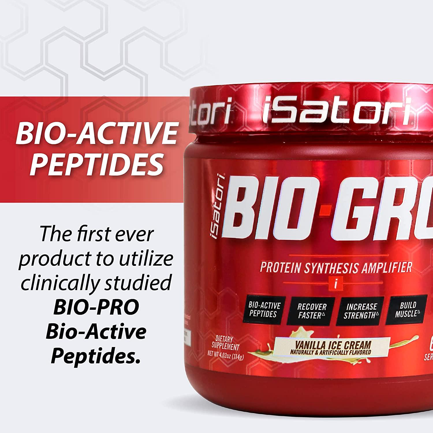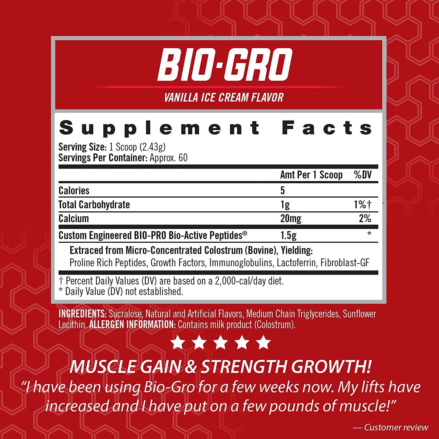- MAXIMUM PROTEIN SYNTHESIS: BIO-GRO delivers 1.5 grams of Micro-Concentrated Bio-Pro Bio-Active Peptides per serving. Sugar-Free, Gluten-Free, and Stimulant Free ingredients