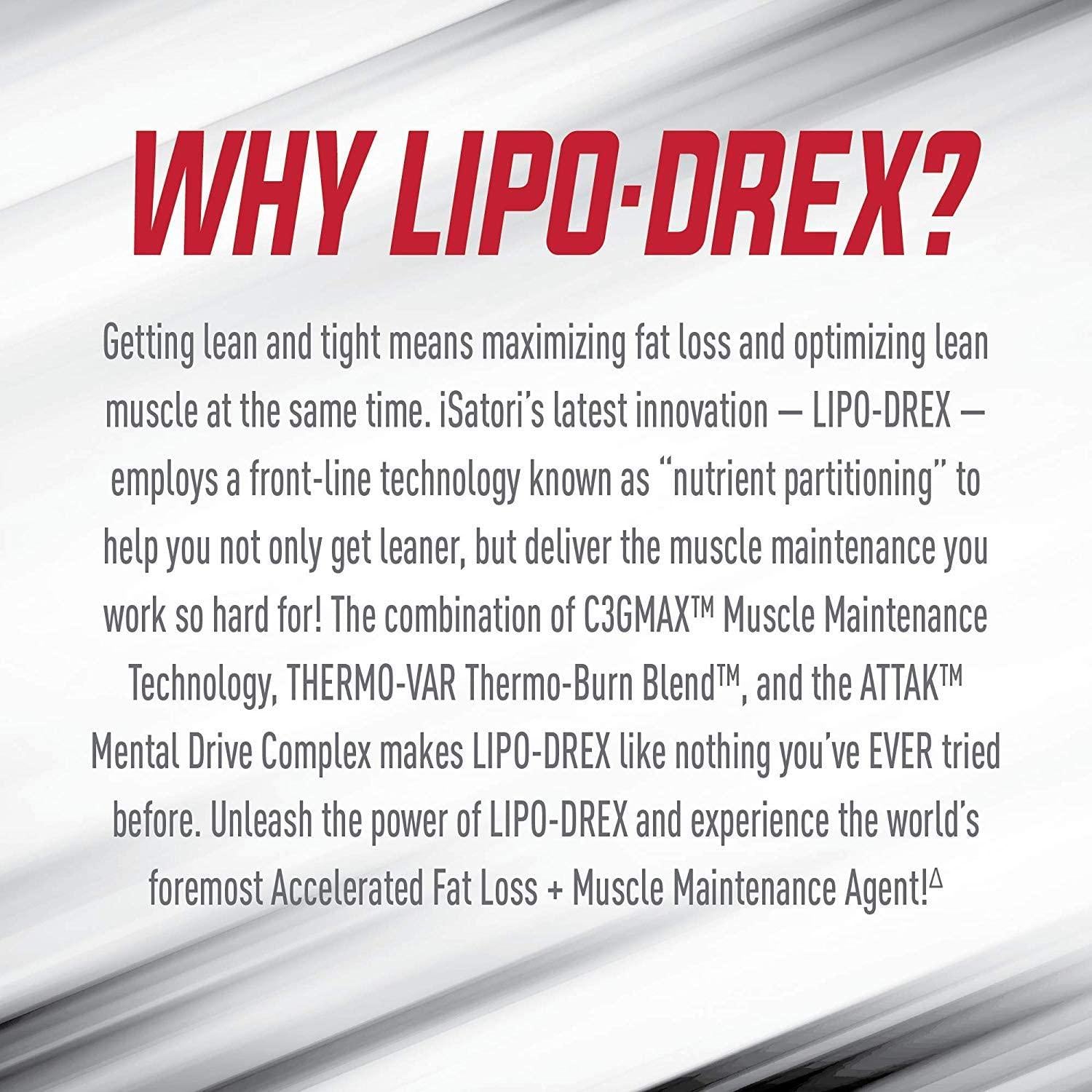 HIGH-STIMULANT THERMOGENIC: Increasing your bodys ability to burn calories is known as an increased metabolic rate or positive thermogenic effect. LIPO-DREX starts as a powerful thermogenic so your body burns more calories throughout the day. This is the core of the LIPO-DREX formula.MAINTAIN MORE MUSCLE: Unique to LIPO-DREX is a precise technology that diverts carbohydrates and fats away from fat stores and directs them to the muscle. This technology is known as nutrient partitioning and is unique to LIPO-DREX.LAZER FOCUS AND ENERGY: One of the most important things when it comes to achieving your overall weight-loss goals is having superior focus and energy. Lower calorie diets can rob you of energy and mental clarity, so LIPO-DREX is designed to counter those feelings clear focus and high energy.KILL THE CRAVINGS: The LIPO-DREX formula has been engineered to help you with your appetite and cravings. This is one of the most important aspects of staying on track to reach your goal of a leaner, more defined physique. Take LIPO-DREX before your first meal and let it go to work for you!SCIENCE + WORK = RESULTS - iSatori sports nutrition supplements can help support you in reaching your fitness goals. When you work hard at achieving your optimal body performance and endurance, you need to protect your investment. By combining nutritional supplements with your workouts, you leverage our science to maximize higher energy levels and reduce your recovery time.