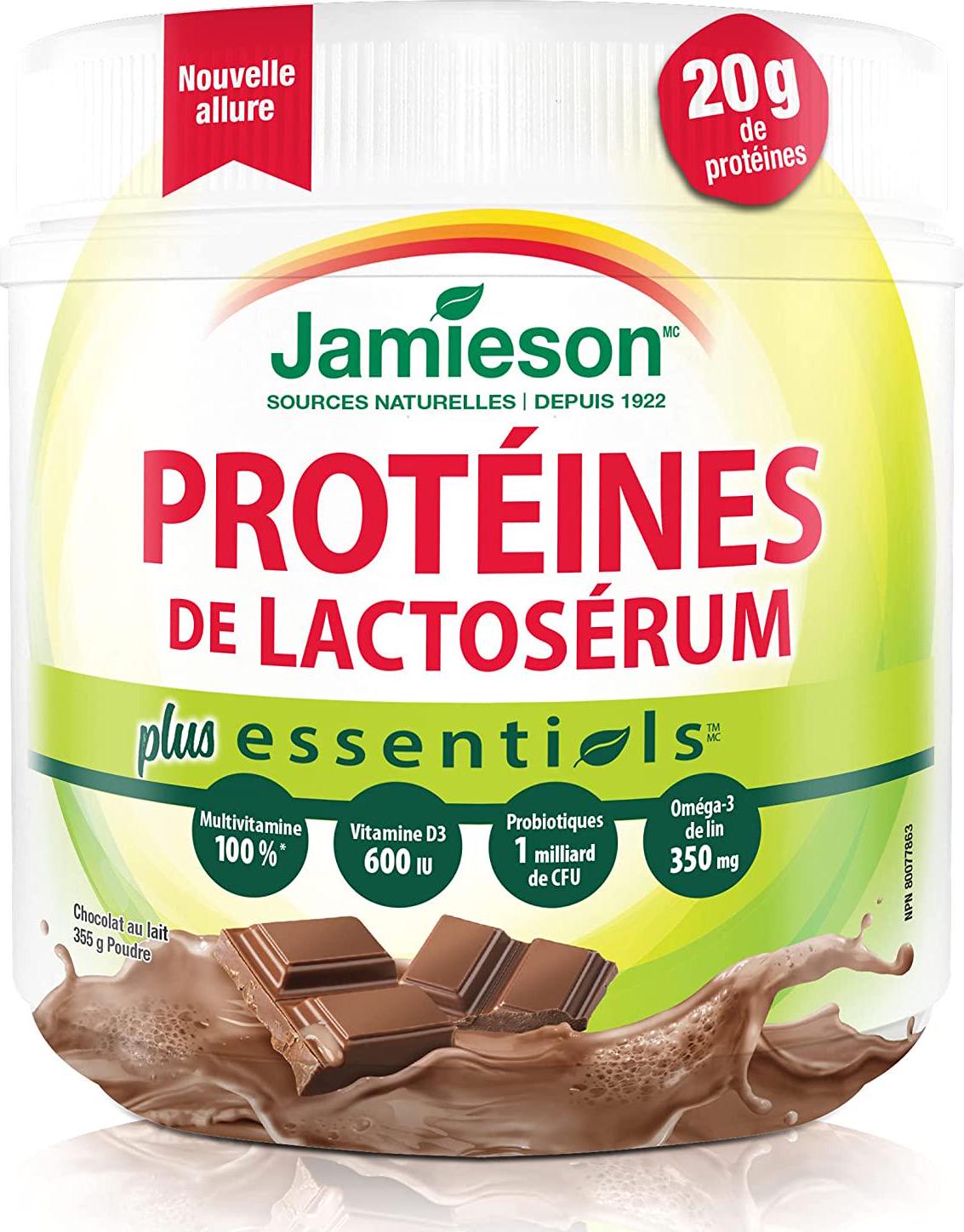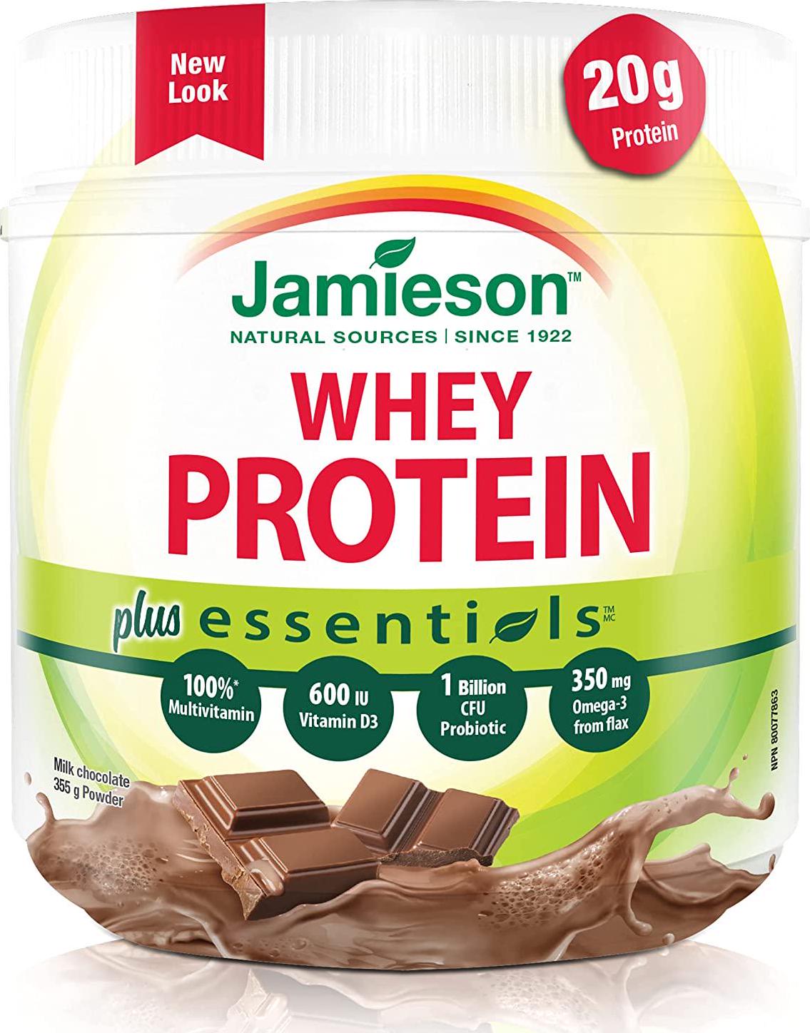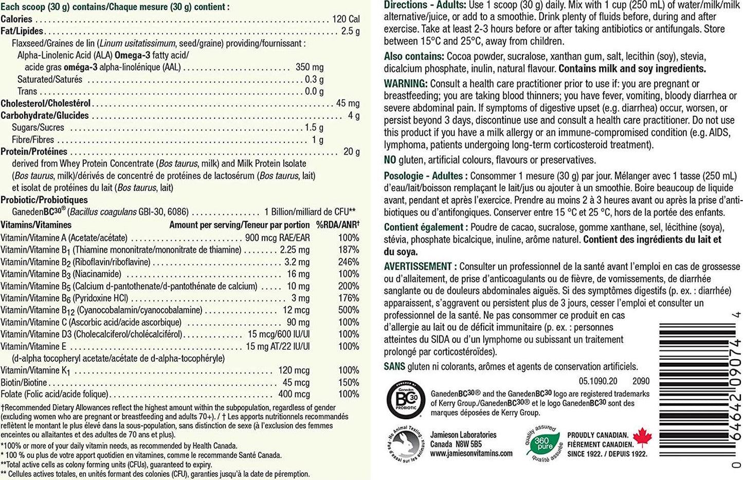 Only protein supplement with all four recommended Jamieson EssentialsTM: 100% Multivitamin, 600 IU Vitamin D, 1 billion CFUs Probiotic & 350mg Omega-3 from Flax Protein provides essential nutrition and energy and Jamieson EssentialsTM Naturally energizing for good health and an excellent source of protein Delicious milk chocolate flavour