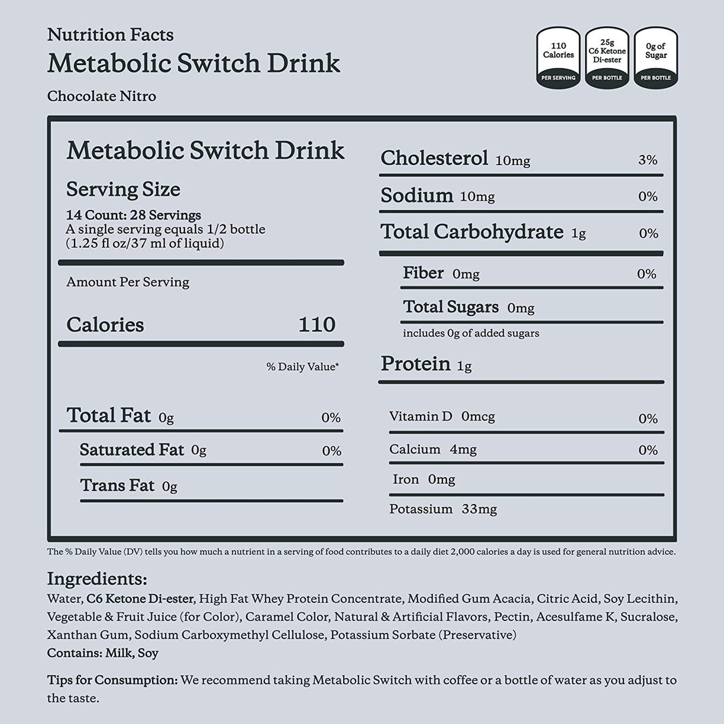 - DRINK: Our customers tell us they prefer their Metabolic Switch chilled and we couldn t agree more. If you are new to Metabolic Switch, take a half bottle with food so your body can get used to the di-ester.