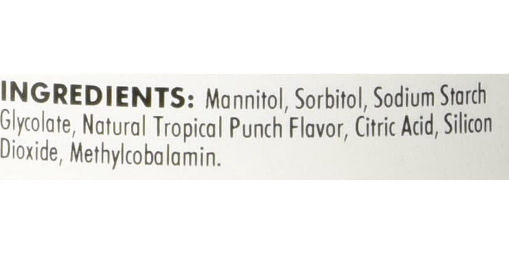 Methylcobalamin Concentrated Powder 2 oz Dietary Supplement Gluten Free / Casein Free Supplement Facts Serving Size: 0.58 grams (1 level scoop) Servings per Container: 98 Amount per Serving Methylcobalamin 5000 mcg INGREDIENTS: Mannitol Sorbitol Sodium Starch Glycolate Natural Tropical Punch Flavor Citric Acid Silicon Dioxide Methylcobalamin. SUGGESTED USE: Place 1/2 to 1 level scoop of powder under the tongue and allow the powder to dissolve or dissolve in a liquid and drink immediately (do not store unused liquid). FREE OF: Sugar soy wheat casein gluten preservatives egg yeast gelatin artificial flavorings or colorings peanuts tree nuts or fish. IMPORTANT: STORE IN A COOL DRY PLACE AND TIGHTLY CAPPED. KEEP OUT OF THE REACH OF CHILDREN.
