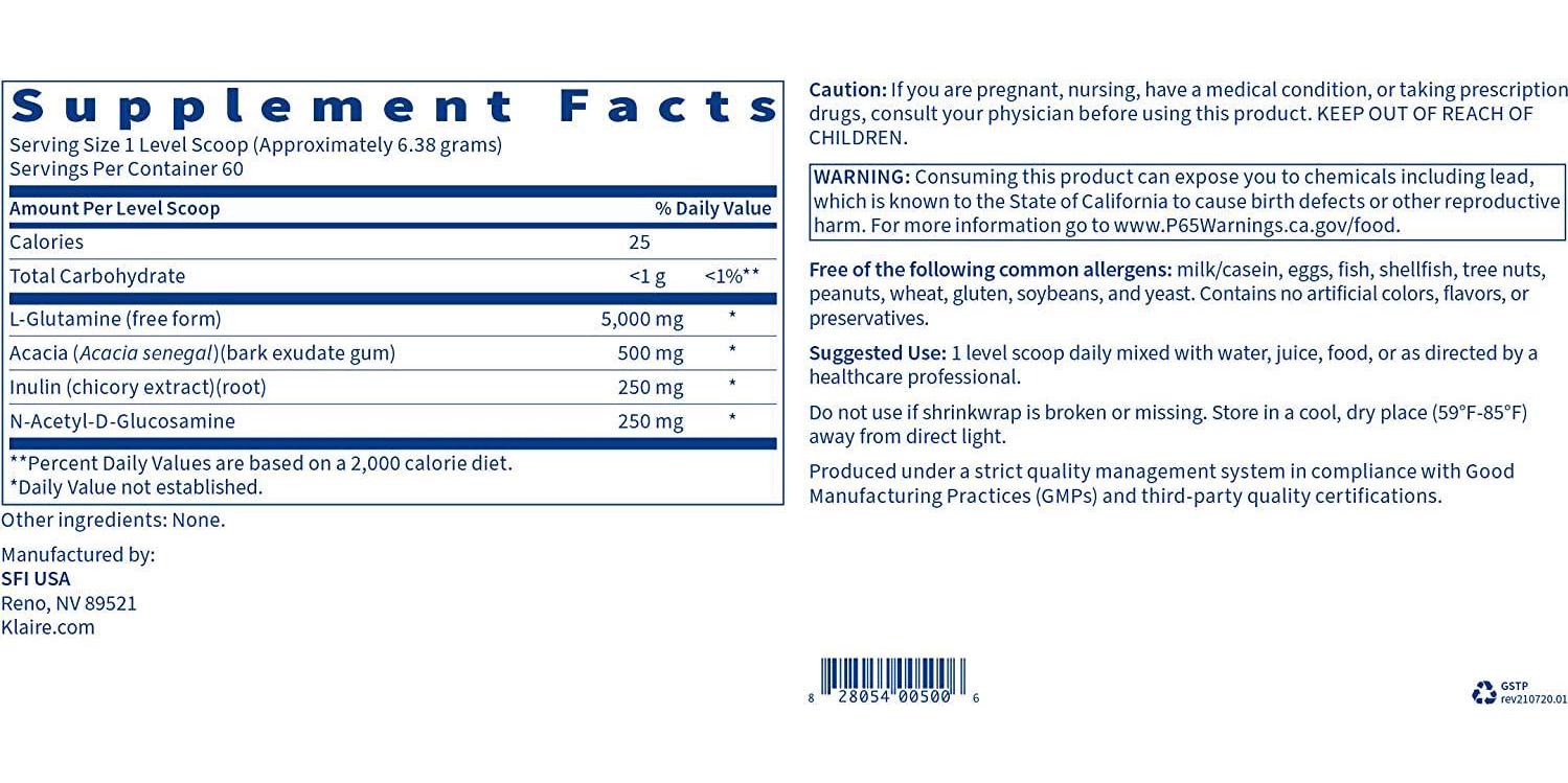 Klaire Labs Gastrothera Powder - 5000mg L-Glutamine Powder N-Acetyl-D-Glucosamine & Prebiotic Fiber - Gut Health Support - Gluten-Free Glutamine Powder, Add to Juice, Water, Food (60 Servings / 360g)