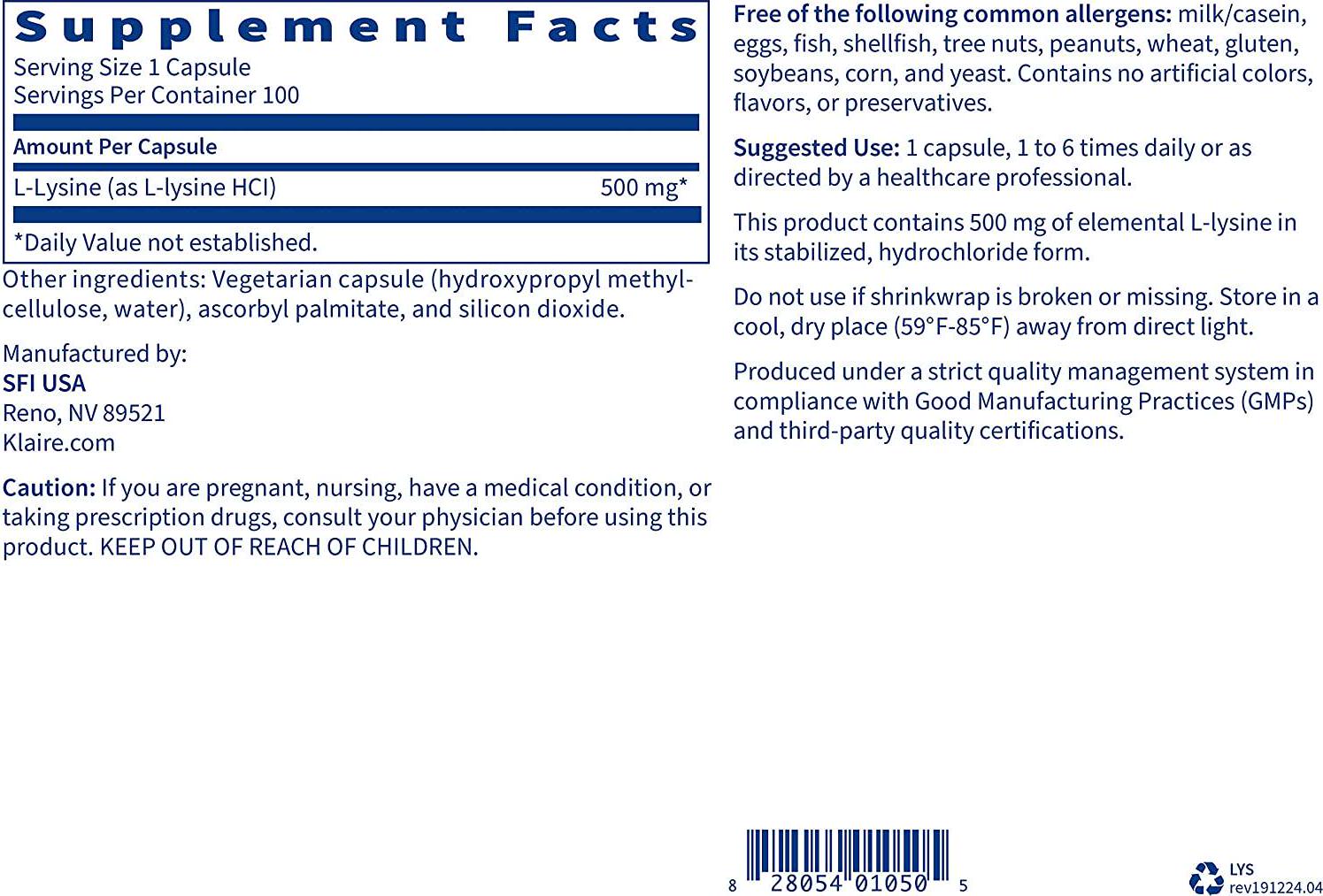 Klaire Labs L-Lysine - 500 Milligrams Essential Amino Acid Support for Immune Health and Collagen Formation, Hypoallergenic and Dairy-Free (100 Capsules)