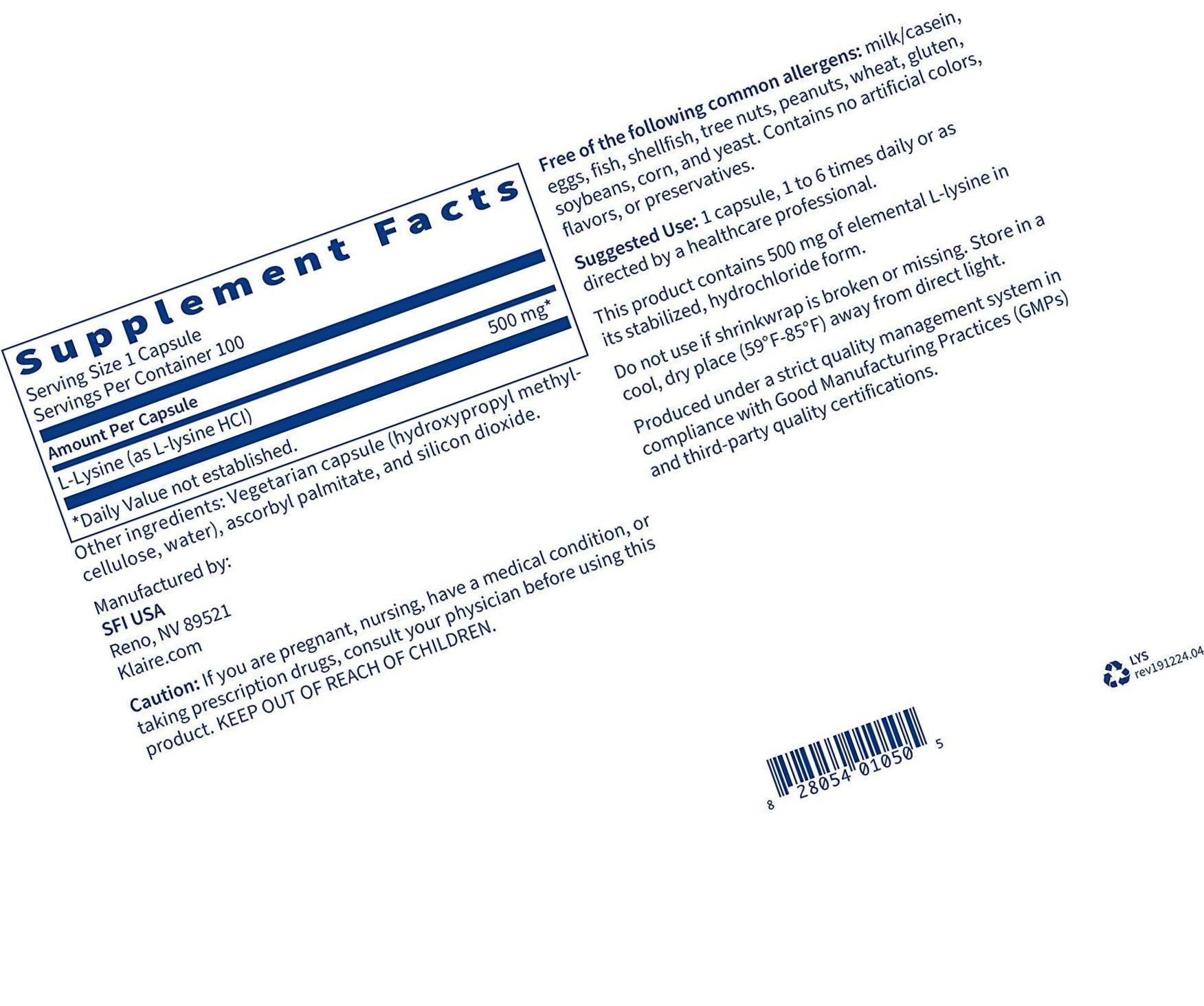 Klaire Labs L-Lysine - 500 Milligrams Essential Amino Acid Support for Immune Health and Collagen Formation, Hypoallergenic and Dairy-Free (100 Capsules)