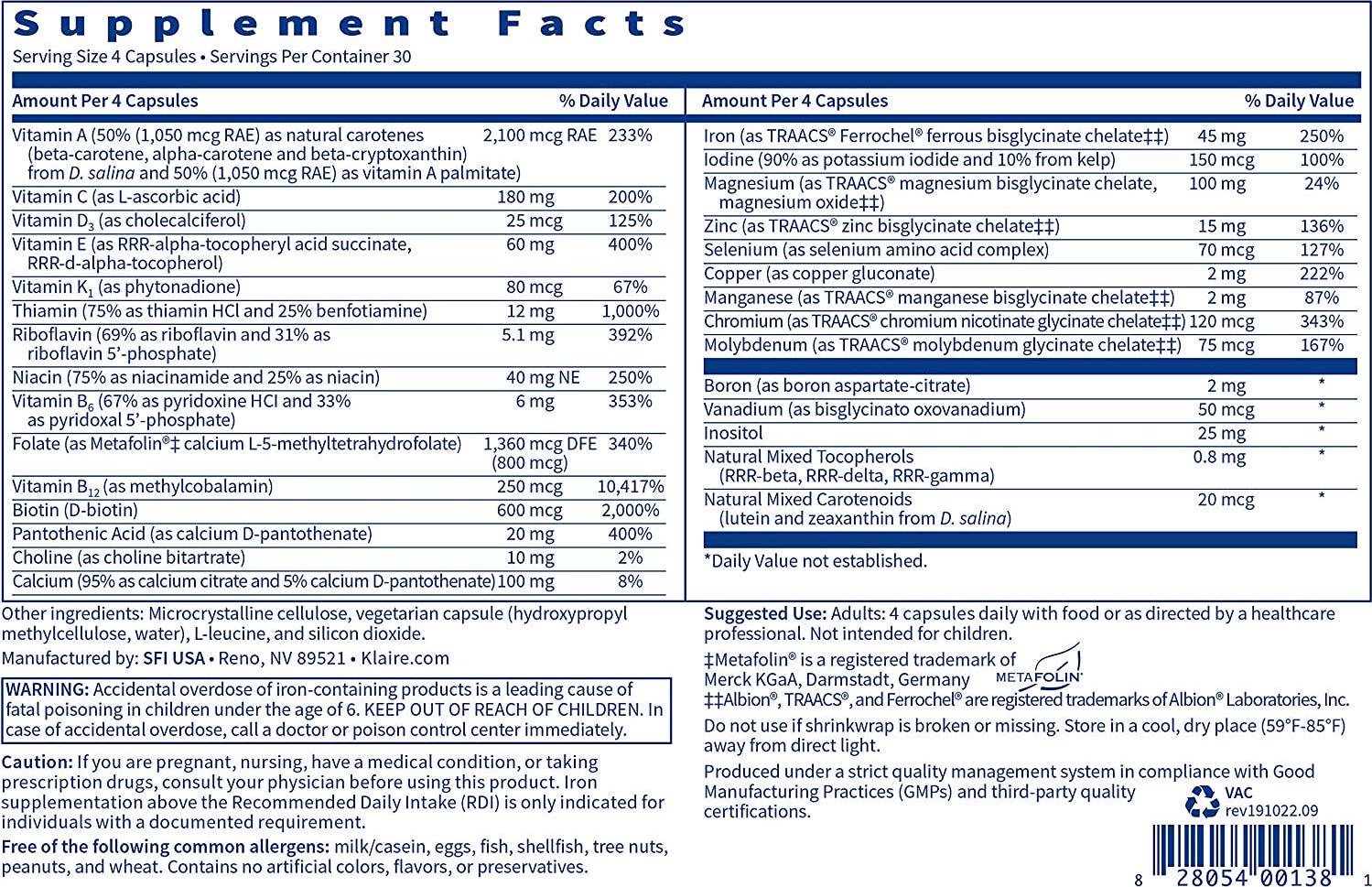 Klaire Labs Vitalactiv - Bariatric Multivitamin and Mineral Supplement, Hypoallergenic with Active Folate and Chelated Minerals (120 Capsules)