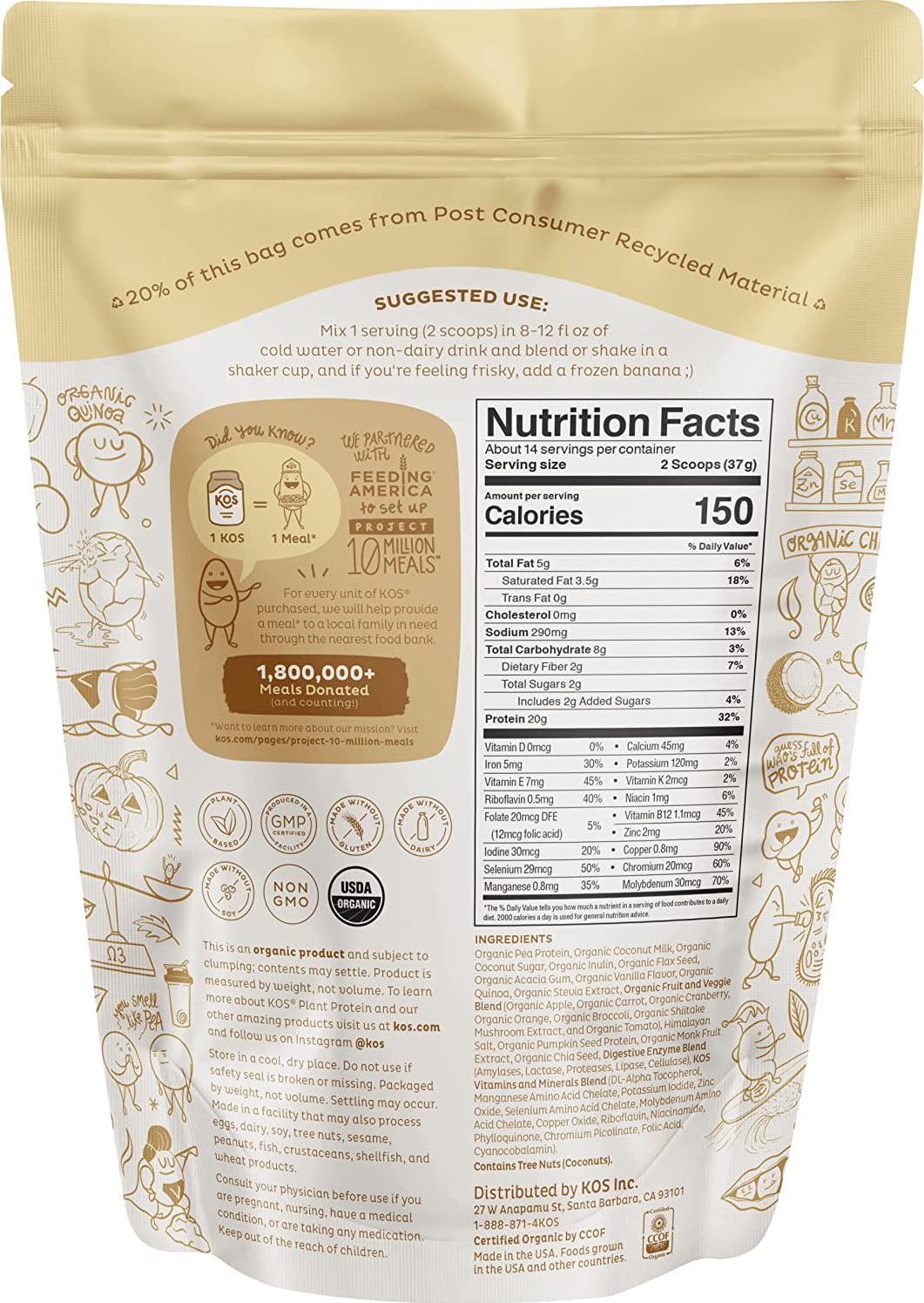 KOS Vegan Protein Powder Vanilla - Plant Based, Organic, Keto Friendly - 1.25 Pounds, 14 Servings